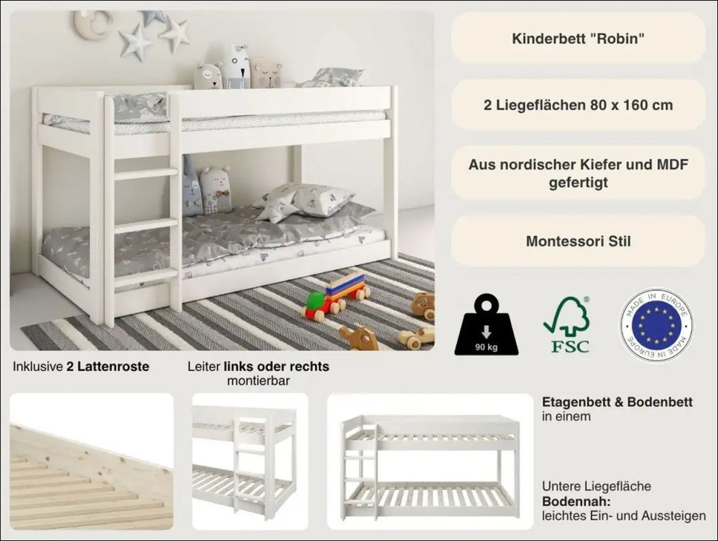Universalus naudojimas kaip lova ant grindų arba kaip dviaukštė lova įvairiems miegojimo poreikiams; Kopėčias ir prieigos tašką galima lanksčiai montuoti atvirkščiai, kad būtų galima individualiai pritaikyti kambarį. Pagaminta iš sertifikuotos medienos masyvo, kad lovos rėmas būtų tvirtas ir patvarus; Montessori metodas skatina vaiko savarankiškumą ir vystymąsi. Maždaug 66 cm atstumas tarp miegamųjų paviršių užtikrina patogią erdvę abiem miegojimo lygiais. Keliamoji galia - 90 kg; Su grotelėmis; Čiužiniai nepridedami; “Roomie Kidz”; Siuntimo pakuotė gali būti ne originali, prekė siunčiama pilnai arba dalinai surinkta; |