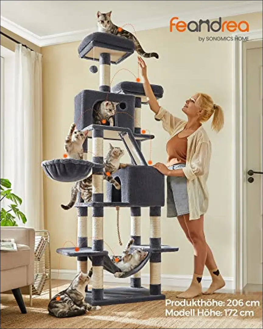 This cat tree is 206 cm high and has 5 levels, with short distances of 30-40 cm between levels, so your cats will be able to climb up and down with ease. Perfect for cats that like high places.
