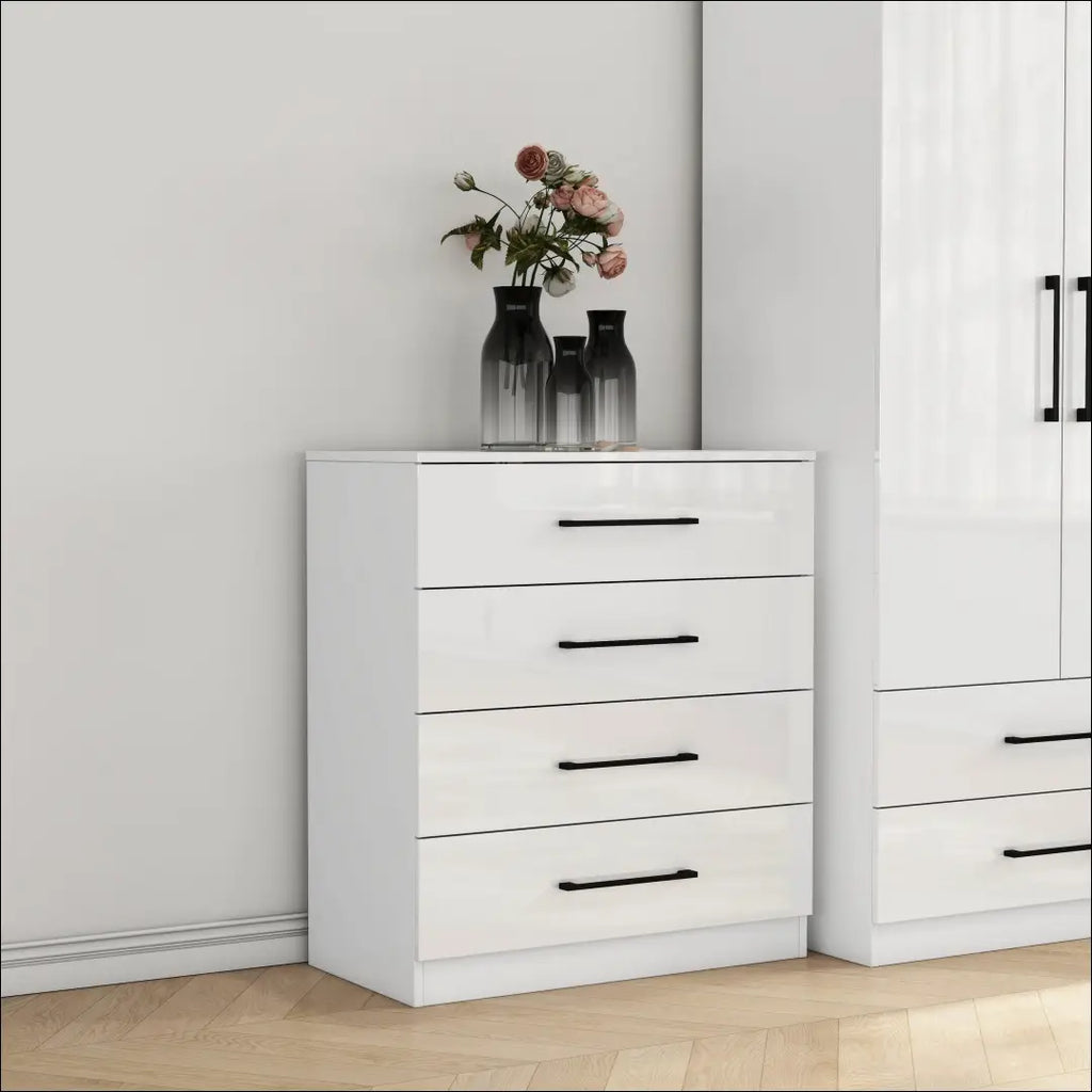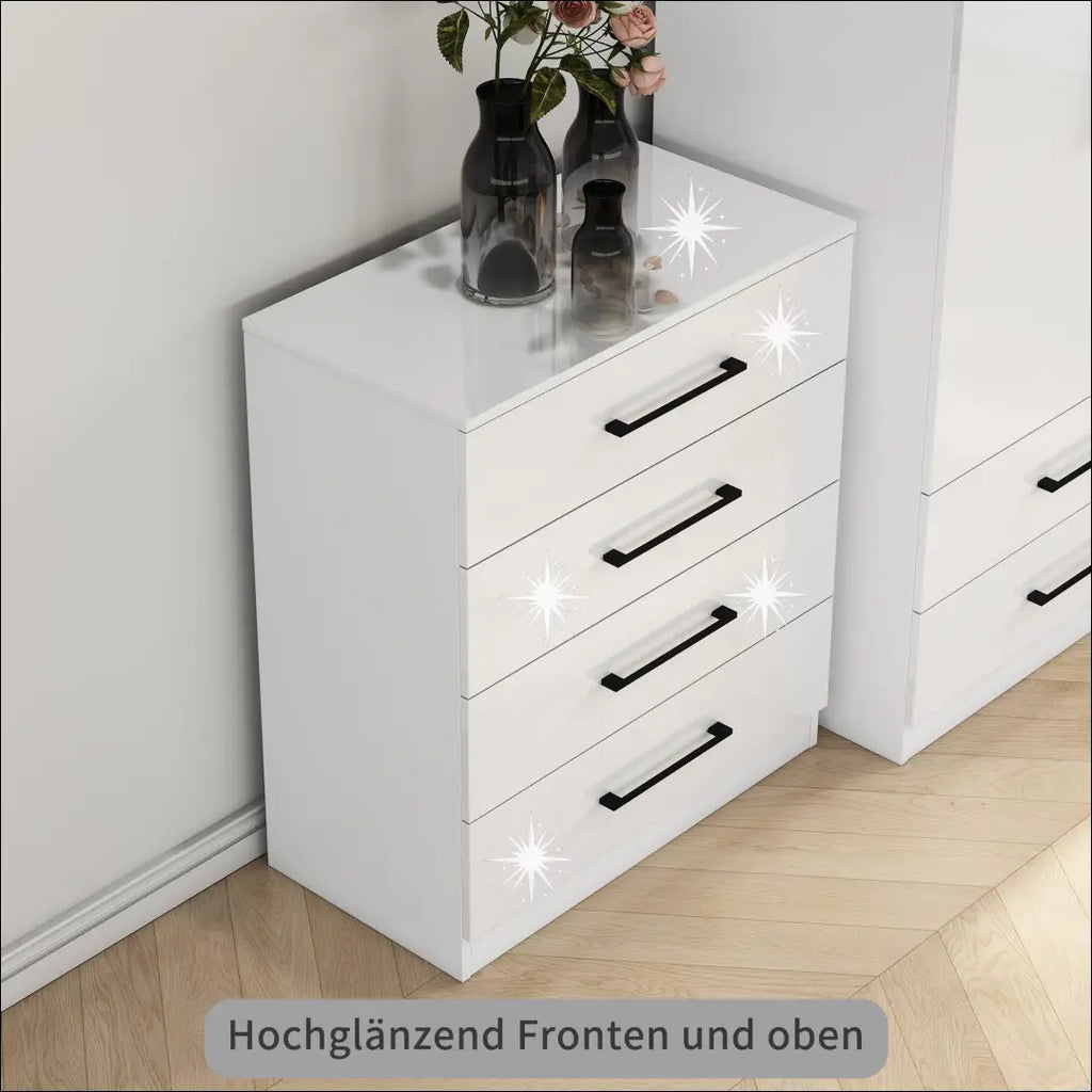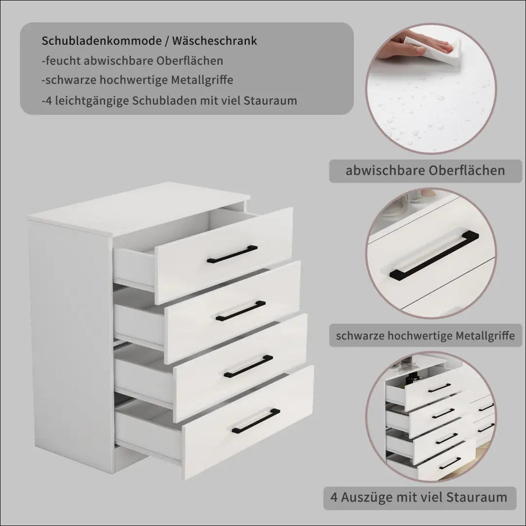 Šioje komodoje yra keturi erdvūs stalčiai, todėl akimirksniu sukuriama tvarka. Puikiai tinka drabužiams, dokumentams ar kasdieniams daiktams – kiekvienas daiktas turi savo vietą. Modernus blizgus dizainas: spindintys balti blizgūs fasadai kartu su elegantiškomis juodo metalo rankenėlėmis suteikia jūsų namams gaivos ir modernumo. “Perspections”; Siuntimo pakuotė gali būti ne originali, prekė siunčiama pilnai arba dalinai surinkta; |