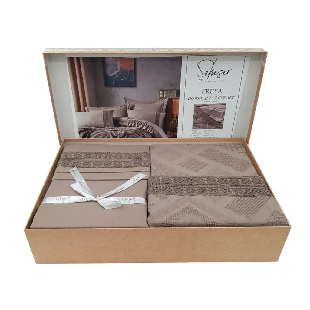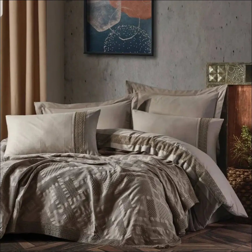 Patalynė su lovatiese pagaminta iš natūralių ekologiškų medžiagų, kurios prisideda prie gero miego ir poilsio, tai galimybė padaryti savo miegojimo vietą gražią ir jaukią dėl plataus audinių tekstūrų ir spalvų pasirinkimo. Pirkdami patalynę ir lovatiesę, gaunate aukštos kokybės audinį ir patį gaminį; Šiame komplekte lovatiesė yra išskirtinio žakardo pynimo. Komplektas dekoruotas subtiliais nėriniais; Galite skalbti rankomis ir skalbimo mašina, vandens temperatūra ne aukštesnė kaip 40 °C; Paklodė su guma; “Saheser”; Siuntimo pakuotė gali būti ne originali, prekė siunčiama pilnai arba dalinai surinkta; |
