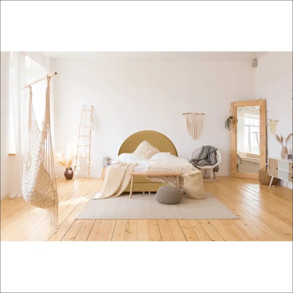 Velvet fabric with an elegant, light sheen, soft, flowing and pleasant on the skin. The fabric has been treated with a Cleanaboo coating, which reduces the absorption of liquids into the fabric structure. The fabric is also PETPROOF, OEKO TEX® Standard 100 and Reach certified. Martindale test: 60,000 cycles. Weight: 300gsm; Stylish headboard in the shape of a half-moon, decorated with beautiful handmade tubes; Corrigan Studio; The shipping packaging may not be original, the product is sent fully or partially assembled; |