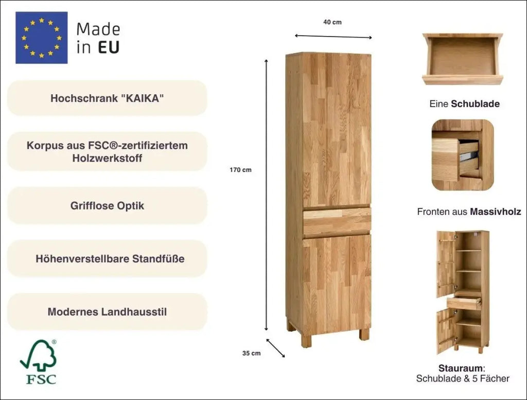 Užimanti minimaliai vietos, tačiau siūlanti daug vietos daiktams susidėti, aukšta spintelė „Kaika“ iš „Home affaire“ serijos puikiai tinka vonios kambariui. Elegantiškas dizainas su diskretiškai integruotomis rankenomis yra vizualiai patrauklus. Vidus, padalintas į lentynas ir stalčius, siūlo universalius daiktų laikymo sprendimus, idealiai tinkančius vonios rankšluosčiams, tualetiniams reikmenims ir kitiems daiktams. Durys gali būti su dešininiais arba kairiaisiais vyriais. Šie vonios kambario baldai pagaminti iš masyvios medienos, kuri yra sertifikuota FSC®. Metaliniai bėgeliai ir vyriai dar labiau pabrėžia aukštą konstrukcijos kokybę. Vizualiai įspūdinga aukšta spintelė „Kaika“ iš „Home affaire“ užima mažai vietos, tačiau vonios kambaryje suteikia daug vietos daiktams susidėti. “Home Affaire”; Siuntimo pakuotė gali būti ne originali, prekė siunčiama pilnai arba dalinai surinkta; |
