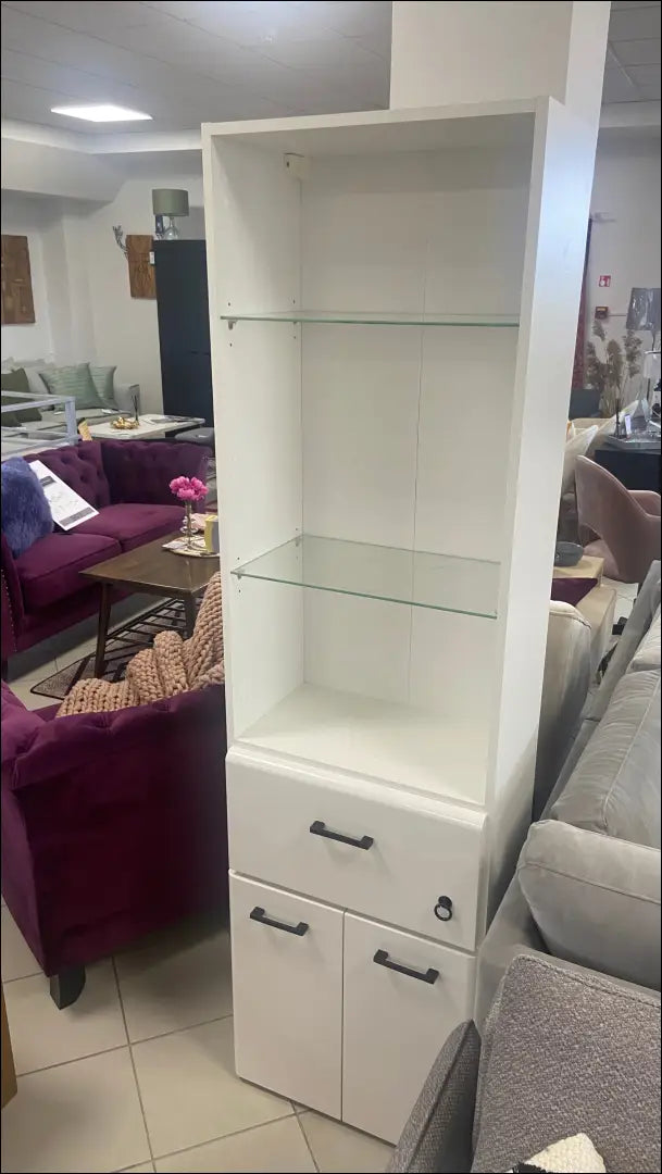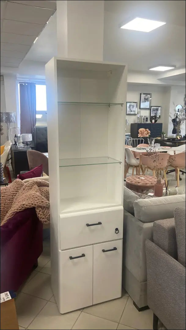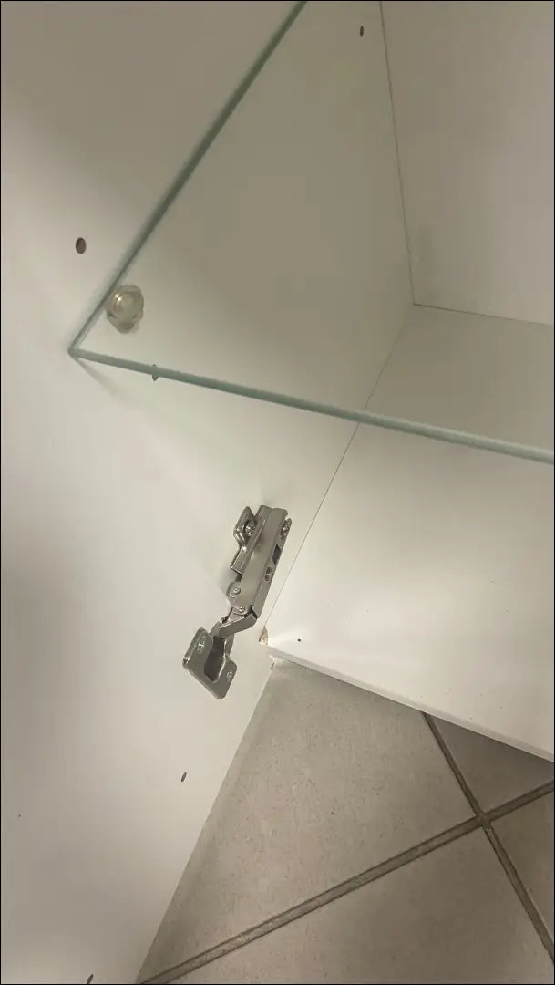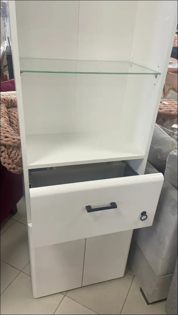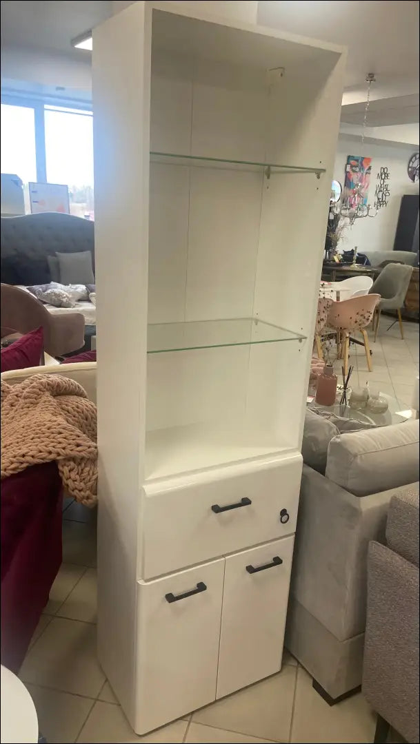 Note: minor beauty flaw (see photos). 1 drawer, 2 doors, 3 glass shelves; Front - white - glossy; Adjustable shelves; Made in Germany; "Quickset"; The shipping packaging may not be original, the product is sent fully or partially assembled. |
