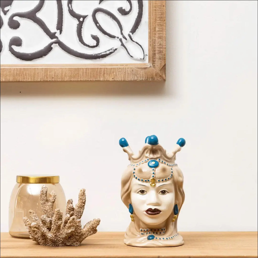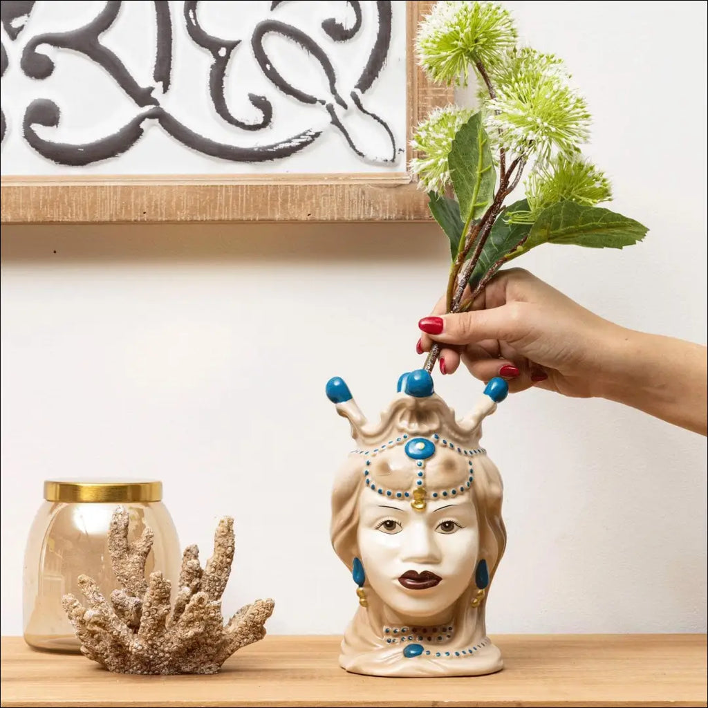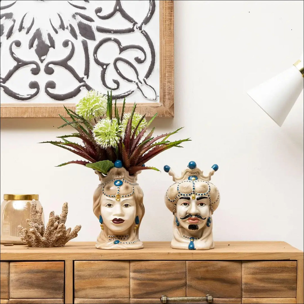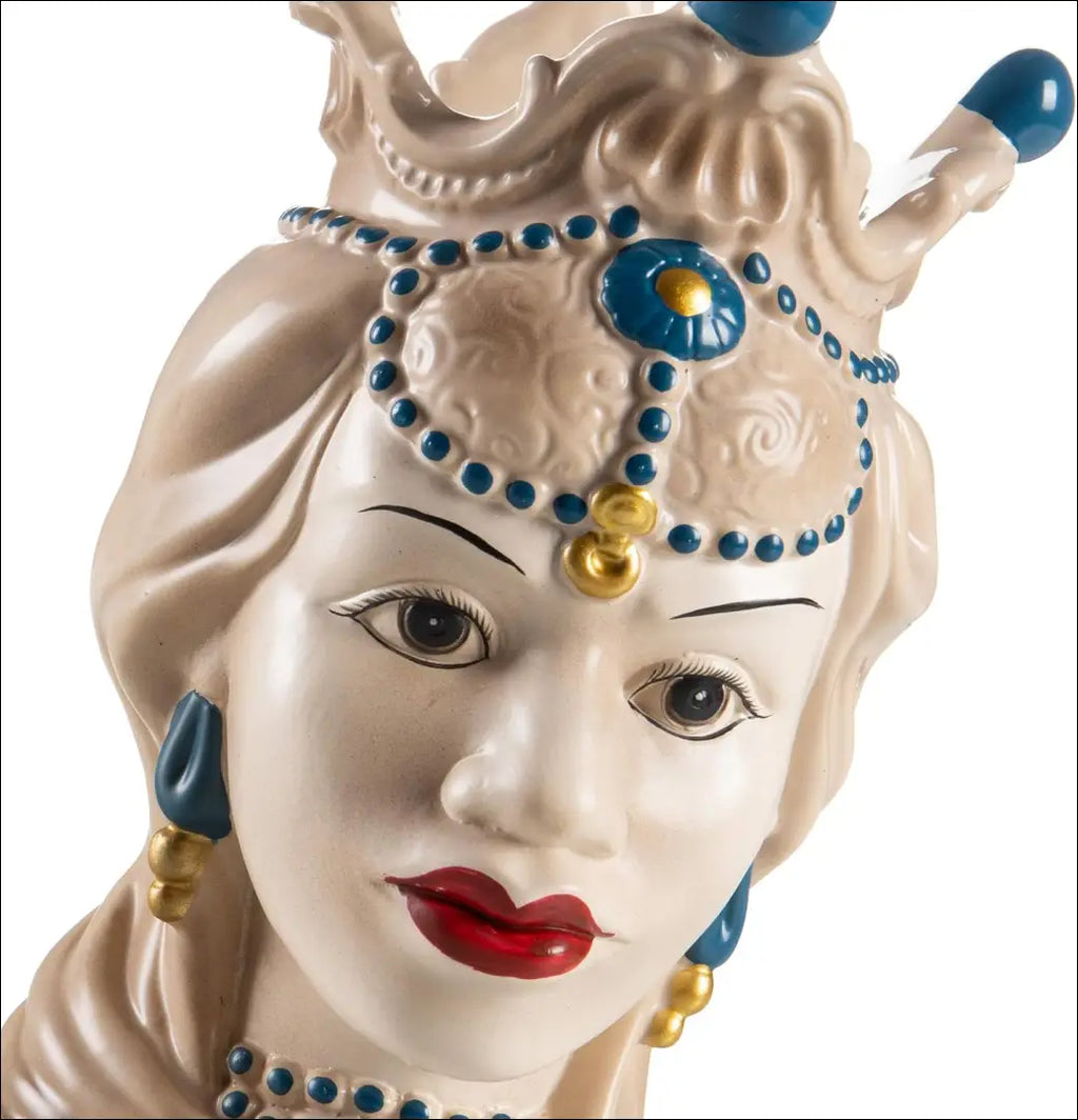 Porcelianinė vaza, rudos spalvos sicilietiško stiliaus galva, dažyta rankomis, karalienės formos, įkvėpta garsiųjų Kaltadžironės galvų sicilietišku stiliumi – būtinas jūsų namų atributas; “Montemaggi”; Siuntimo pakuotė gali būti ne originali, prekė siunčiama pilnai arba dalinai surinkta; |