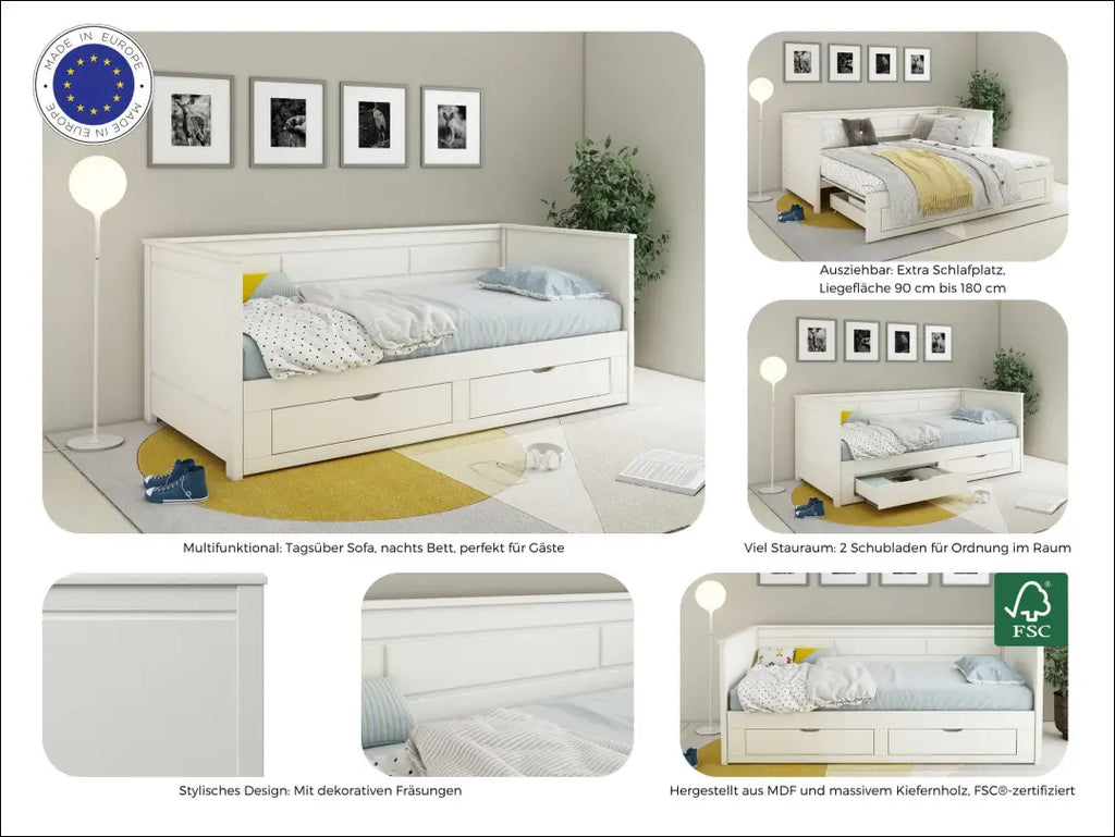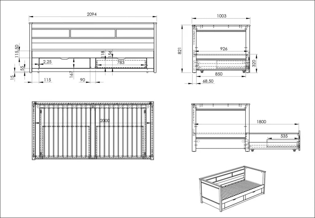 82 cm aukštis x 100,3 cm plotis x 200,9 cm ilgis Miegama dalis - 90 cm x 200 cm - 180 cm x 200 cm |
