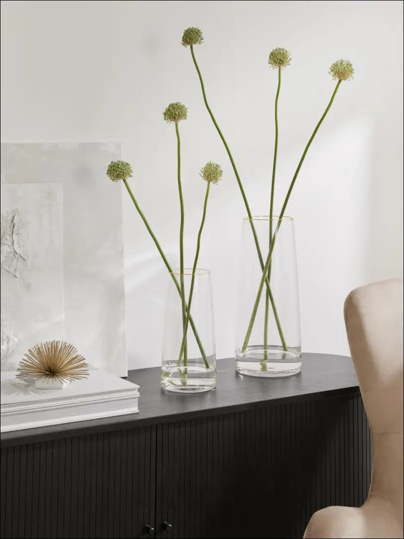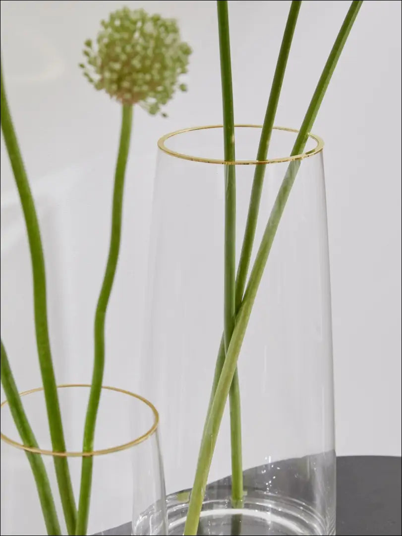 Cylinder-shaped vase; With gold-colored trim; Wash by hand; The shipping packaging may not be original, the item is shipped fully or partially assembled; |