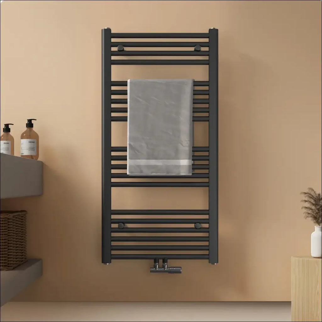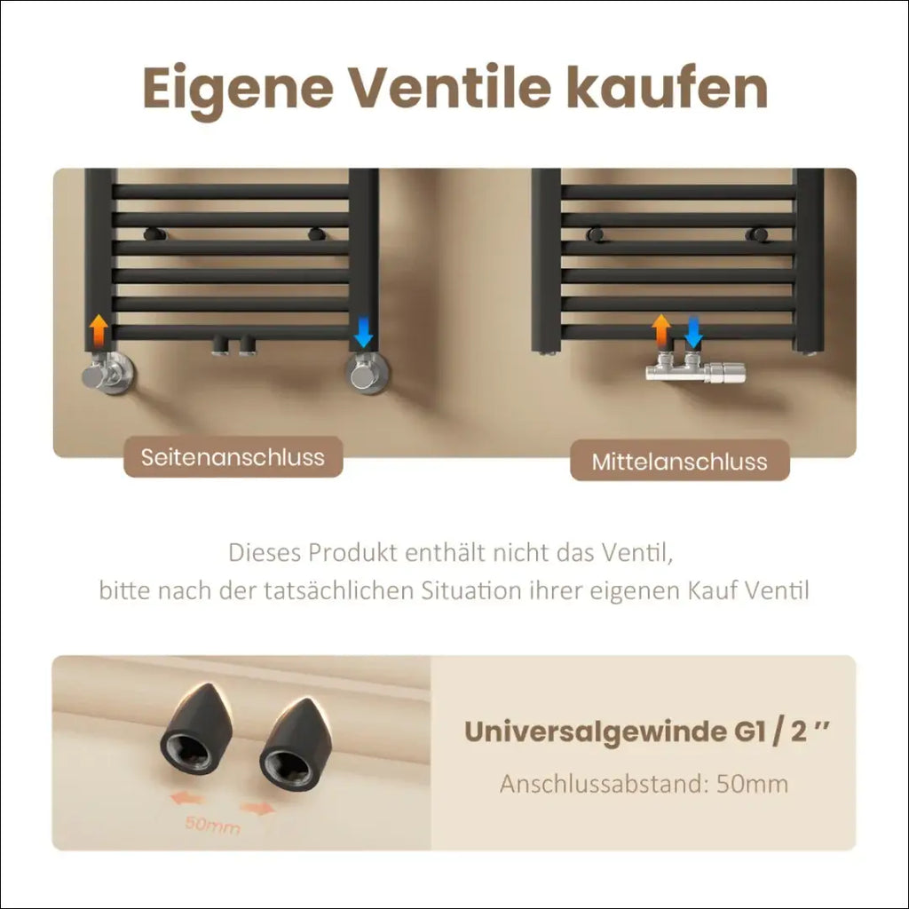 This vertical bathroom radiator with multiple fins is perfect for drying towels and wet clothes. It features efficient heat dissipation and a functional design - ideal for small to medium-sized bathrooms; 382–898 W power – for rooms with an area of 3–8 m²; Central connection with G1/2" thread, connection distance: 50 mm; Distance to the wall: 90–105 mm; Suitable for pipes with a diameter of 16 mm; Made of SPCC steel with environmentally friendly coating; Note: Only suitable for two-pipe heating systems; Holder material: plastic; “EMKE”; The shipping packaging may not be original, the item is shipped fully or partially assembled; |