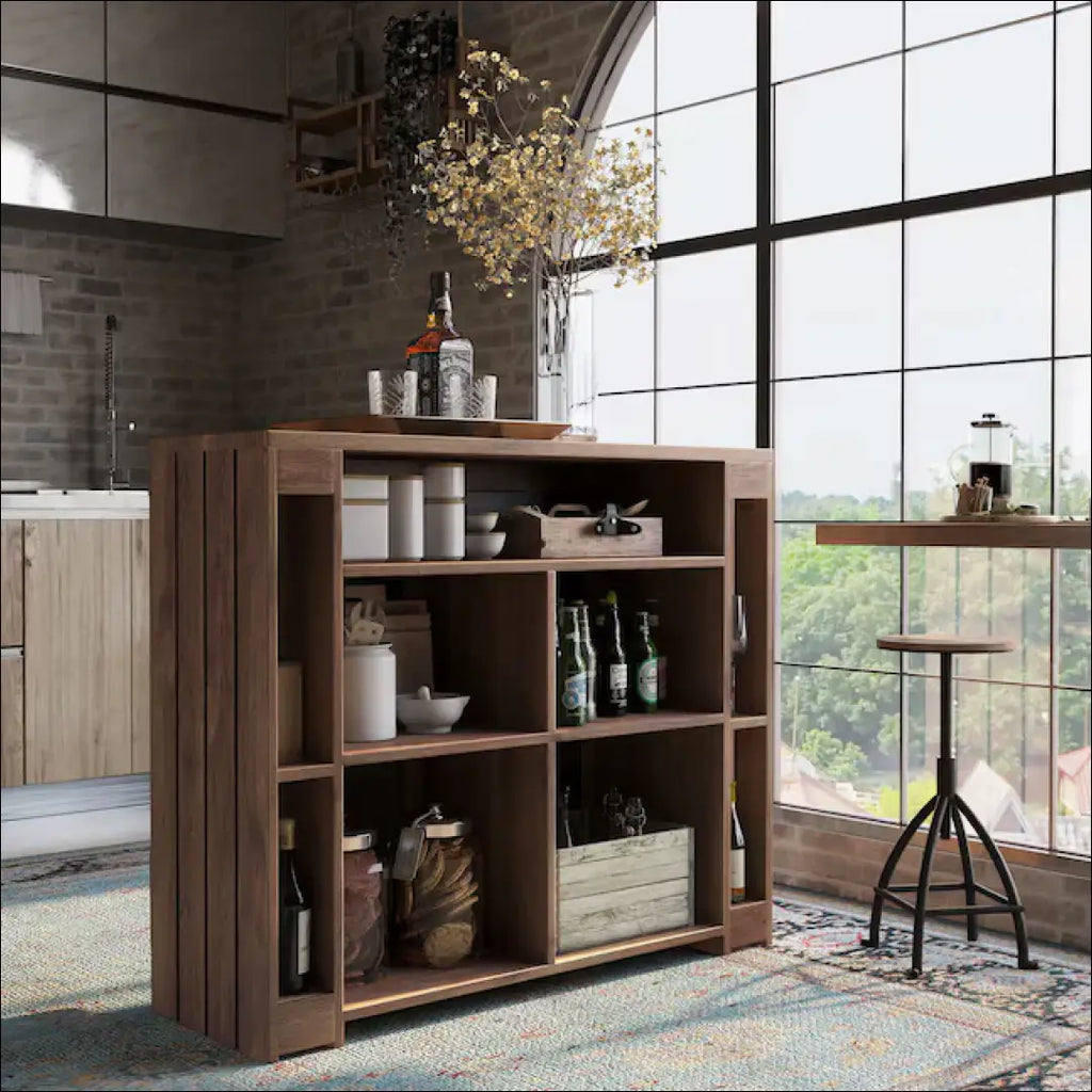 Stilingai patiekite vakarienę ar kokteilių vakarėlį su šiuo žaviu namų baru. Puiki vieta maišyti gėrimus, jis pagamintas iš MDF ir medžio faneros, lentos stiliaus su sendinto riešutmedžio apdaila. Priekyje yra dvi kreidinės lentos plokštės, kuriose galite užrašyti kokteilių pasirinkimus arba vyno meniu. Už baro yra penkios atviros lentynos, o kiekvienoje pusėje yra po dvi papildomas lentynas, kuriose yra daug vietos daiktams susidėti; “Alpen Home”; Siuntimo pakuotė gali būti ne originali, prekė siunčiama pilnai arba dalinai surinkta; |
