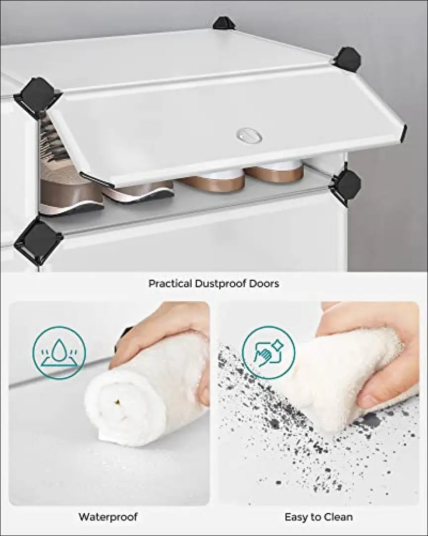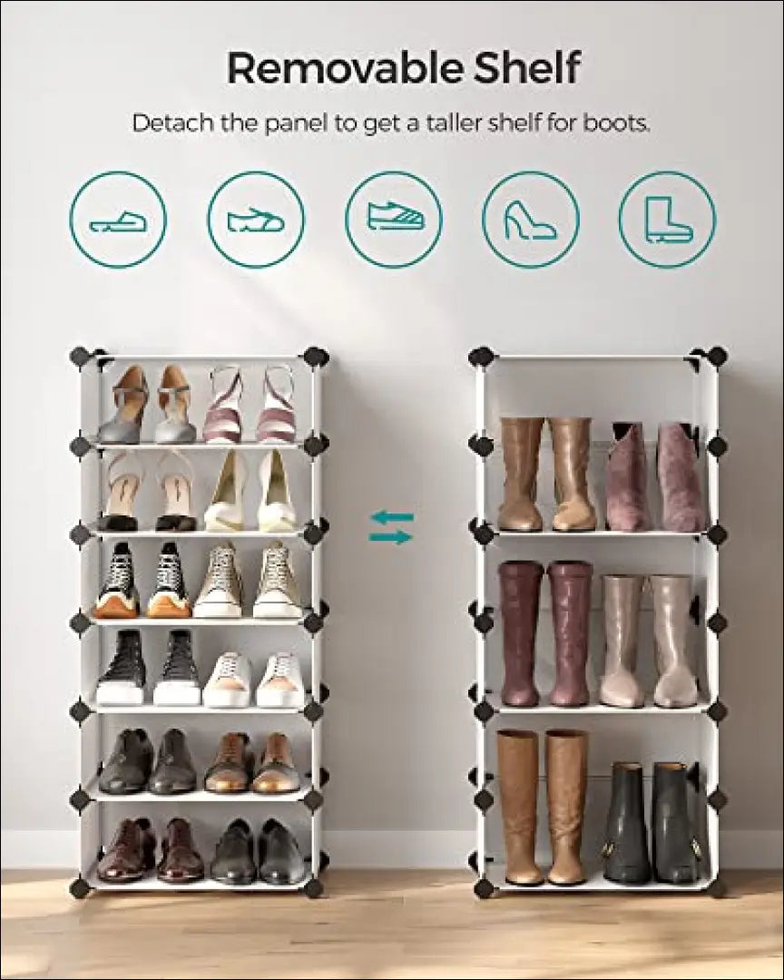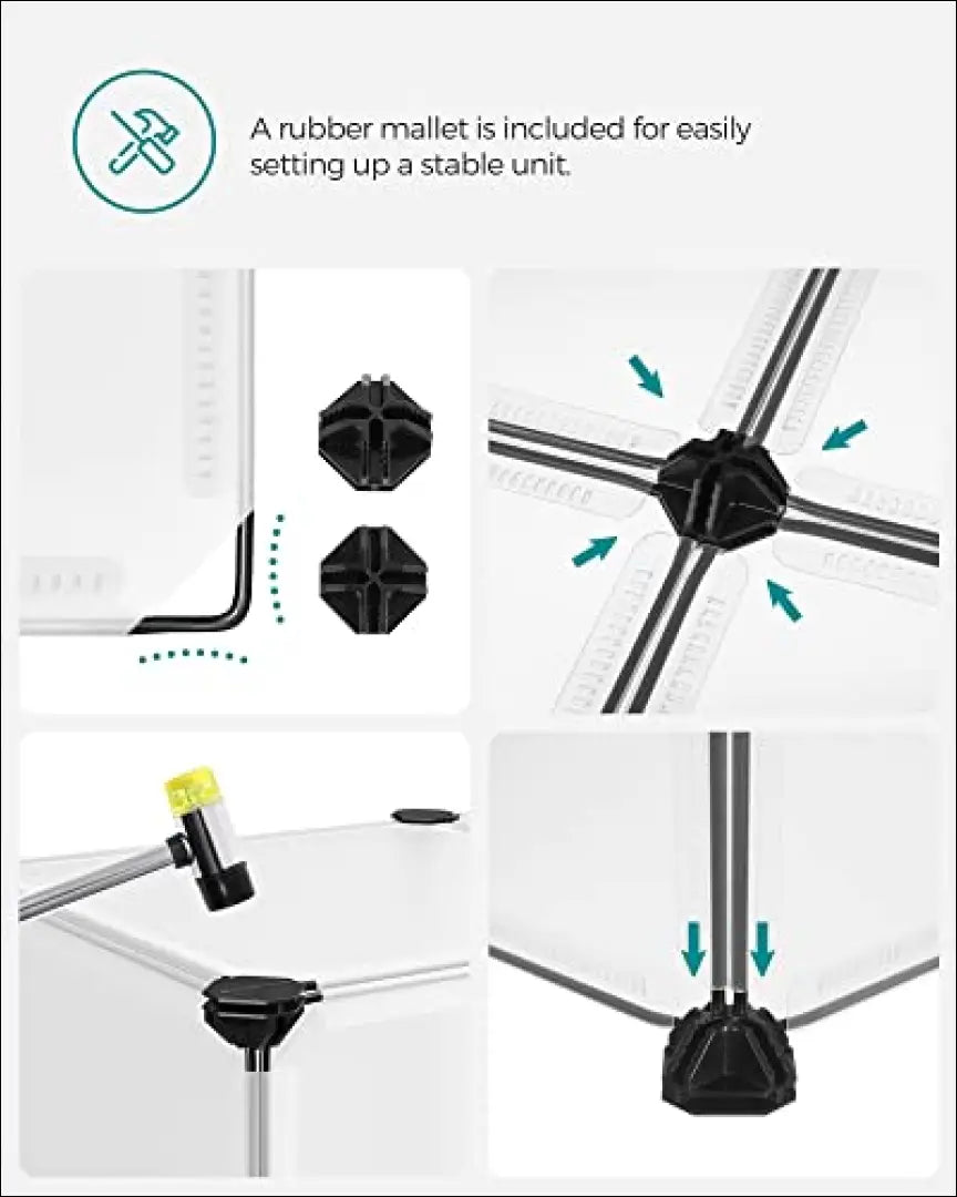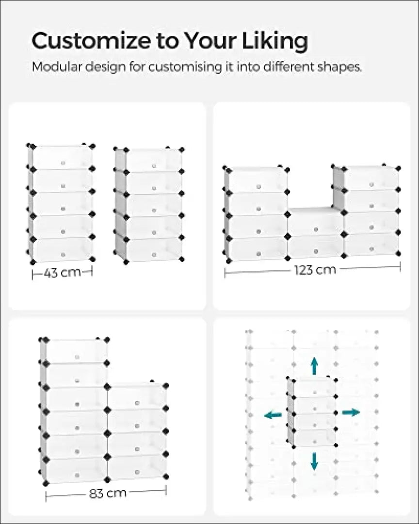 Naudodamiesi pridedamu plaktuku ir aiškiomis instrukcijomis, galėsite lengvai surinkti lentyną. Be to, nuimamas skirstytuvas leidžia sukurti aukštesnes lentynas, puikiai tinkančias aukštakulniams ar pliušiniams žaislams. Šis lankstumas leidžia jums pritaikyti lentyną pagal savo poreikius ir erdvę.