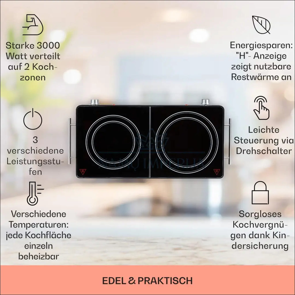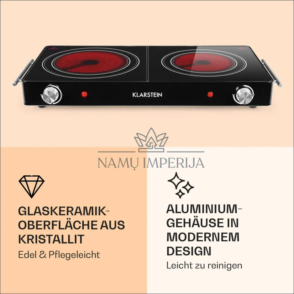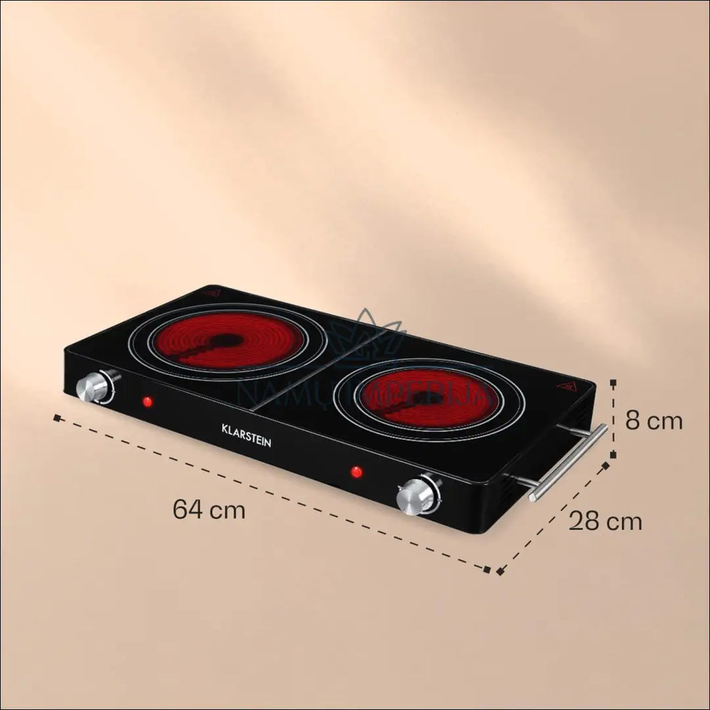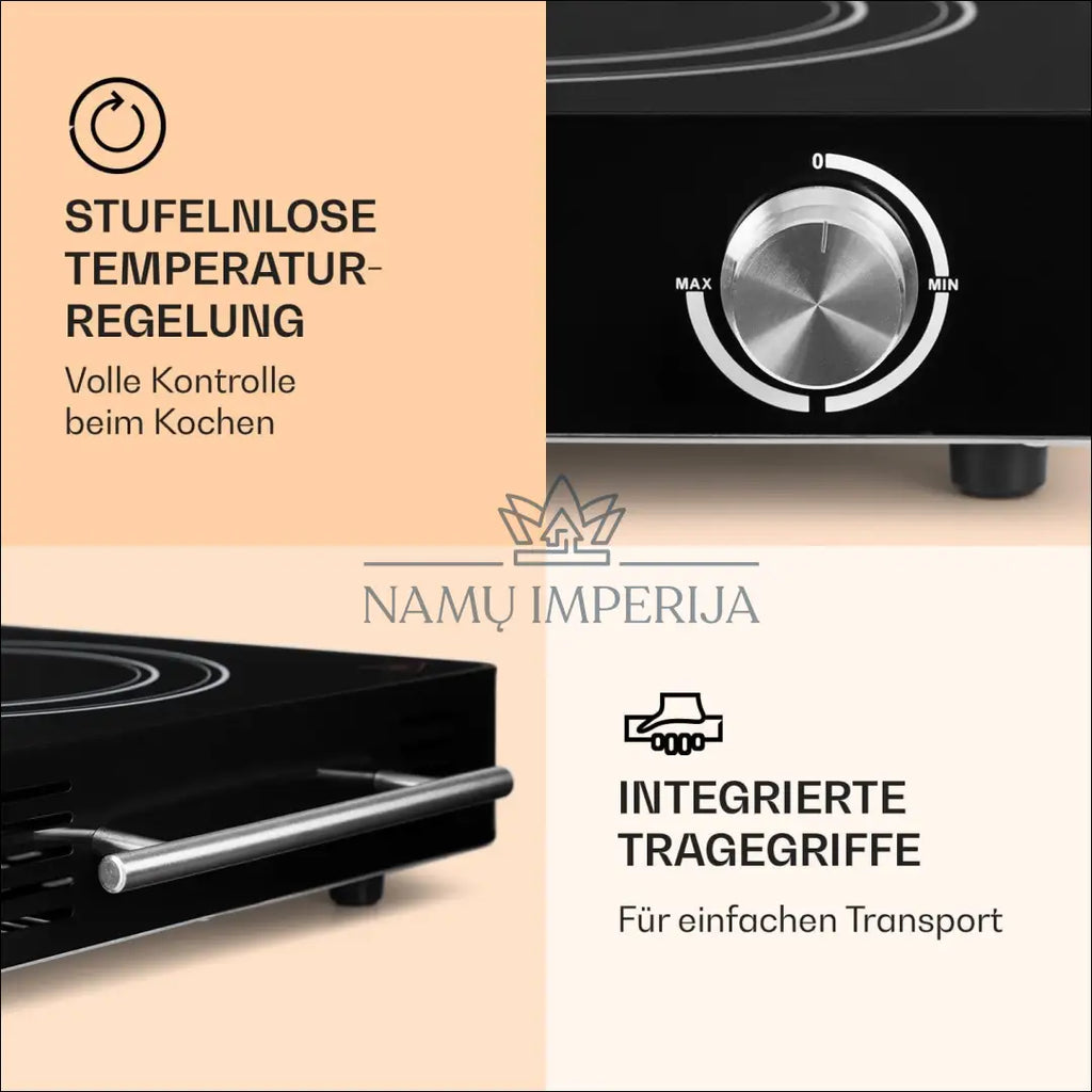 „Klarstein“ infraraudonųjų spindulių kaitlentė, 3000 W, dviguba elektrinė kaitlentė stovyklavimui ir namams, mobili kaitlentė, laisvai pastatoma, greita, 2 kaitlentės, pagamintos iš stiklo keramikos, 2 elektrinės kaitlentės; Gaminkite kaip niekad anksčiau! Skanūs patiekalai greitai ir lengvai iš „Klarstein Varicook Duo“ stiklo keramikos kaitlentės – idealiai tinka jūsų pačių maisto gaminimo potencialui namuose, greito maisto restorane ar stovyklavietėje atskleisti. Kaitlentė su 2 kaitlentėmis turi didelę 3100 vatų galią. Dėl puodo aptikimo mūsų mobilios dvigubos kaitlentės greitai įkaista ir tolygiai šildo puodą. Galinga ir greita; „Klarstein“ elektrinė viryklė turi du 16,5 cm infraraudonųjų spindulių paviršius ir yra maitinama 3000 W (240 V) galia. Infraraudonųjų spindulių kaitlentė greitai įkaista ir tolygiai iškepa maistą, be karštų ar šaltų vietų; Savybės: išmanusis ekologinis šilumos valdymas, skirtas panaudoti likutinę šilumą. 2 infraraudonųjų spindulių sritys maisto gaminimui. Saugos funkcijos: laikmatis, puodo aptikimas, apsauga nuo perkaitimo, vaikų užraktas. „ThermoBoost“ funkcija geresniam maisto gaminimo našumui; Maitinimo šaltinis: 220–240 V ~ 50/60 Hz; “Klarstein”; Siuntimo pakuotė gali būti ne originali, prekė siunčiama pilnai arba dalinai surinkta; |