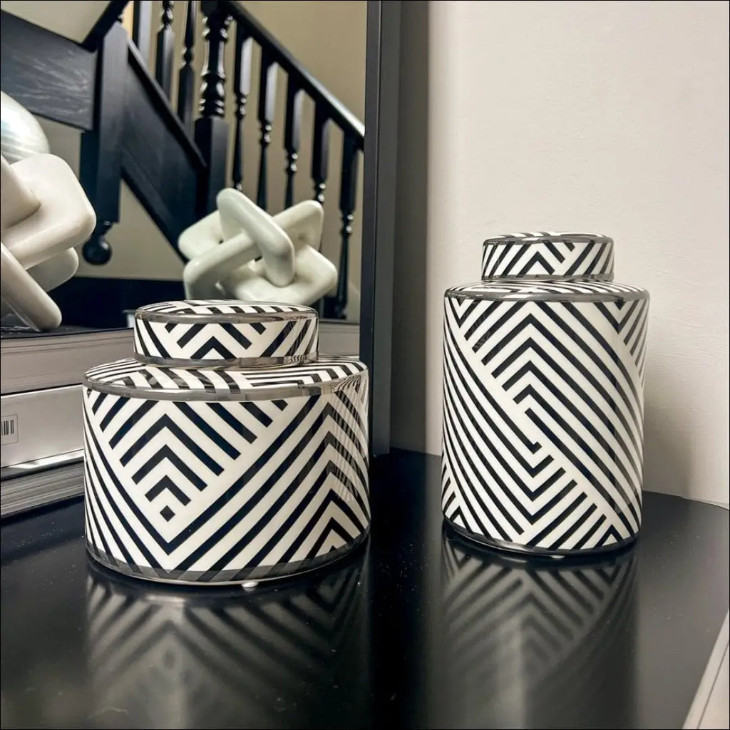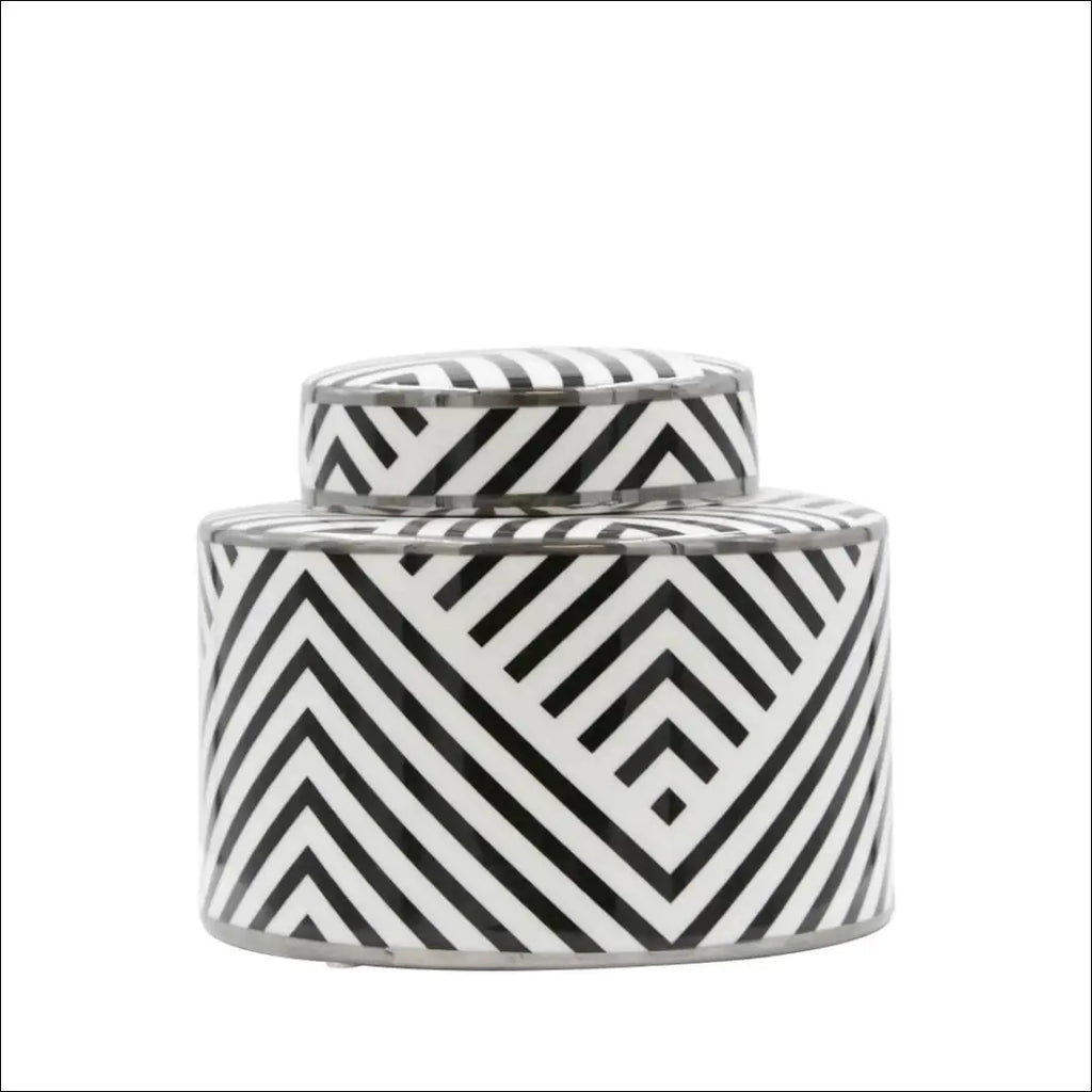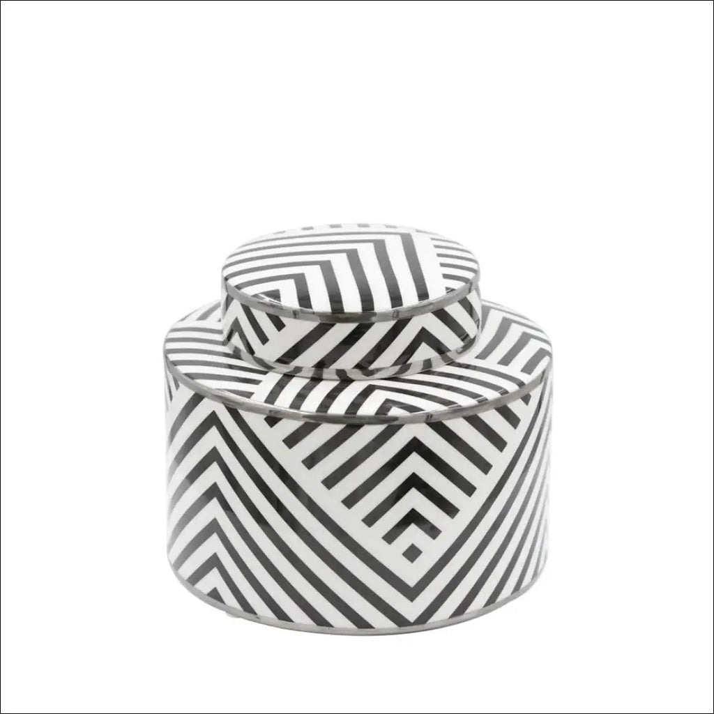 Apvalaus silueto, jis pasižymi zigzago dizainu ryškiai juodai baltai. Blizgi keramika yra prabangi ir tiks jūsų moderniai prabangiai erdvei. Nuimkite dangtelį, kad šiame nuostabiame imbiero indelyje galėtumėte laikyti brangius daiktus; “CIMC”; Siuntimo pakuotė gali būti ne originali, prekė siunčiama pilnai arba dalinai surinkta; |