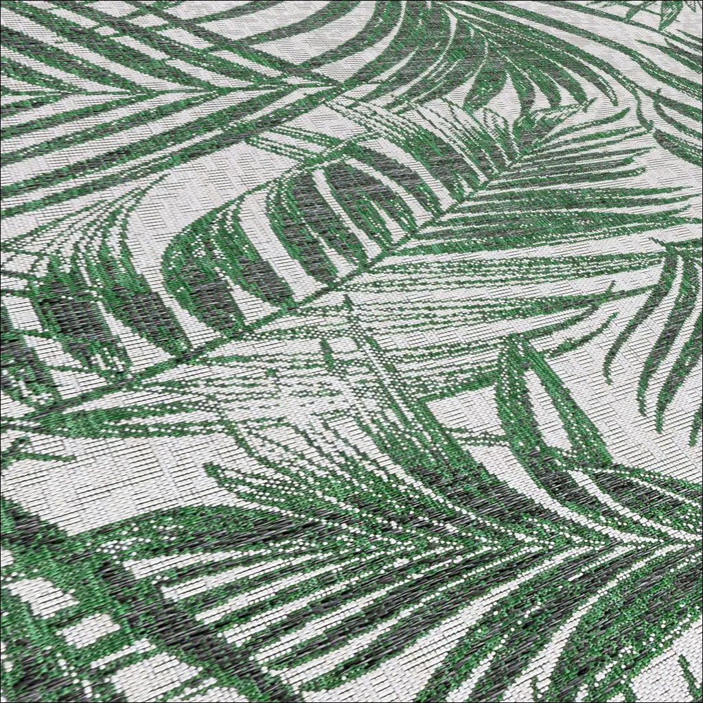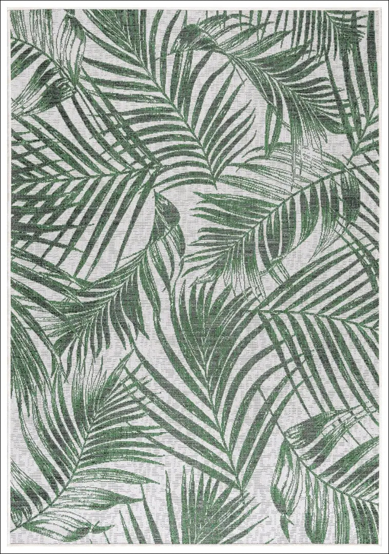 Lauko/terasos kilimas, Palmių dizainas, Pagrindinė spalva - Žalia, Kilimas gali būti naudojamas terasoje, balkone, Apatinės medžiagos sudėtis - Polipropilenas, Įvairūs dydžiai