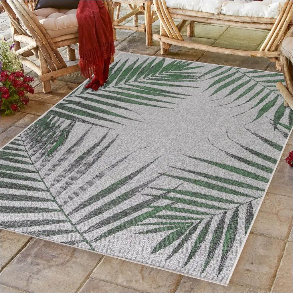 Lauko/terasos kilimas, Palmių dizainas, Pagrindinė spalva - Žalia, pilka Kilimas gali būti naudojamas terasoje, balkone, Apatinės medžiagos sudėtis - Polipropilenas, Įvairūs dydžiai
