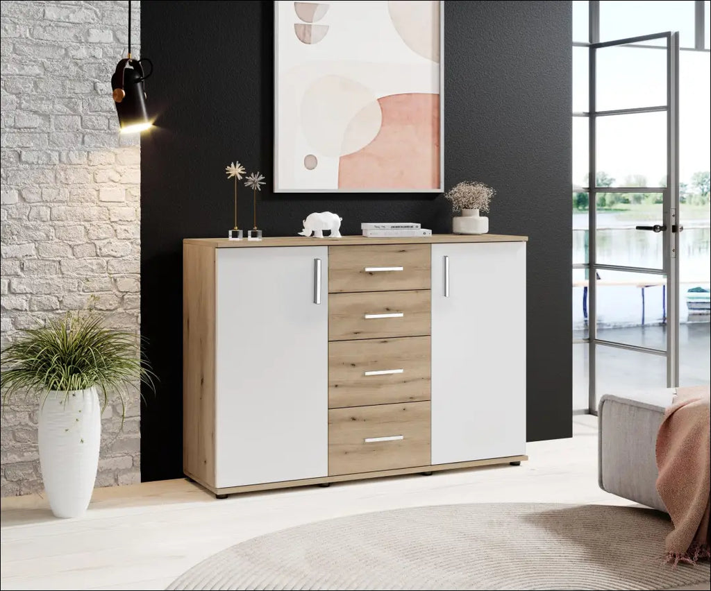 Šiuolaikinio spalvų derinio komoda, universali savo paskirtimi; Spintelė su 2 durelėmis, 4 stalčiais ir 2 lentynomis; “HBZ”; Siuntimo pakuotė gali būti ne originali, prekė siunčiama pilnai arba dalinai surinkta; |