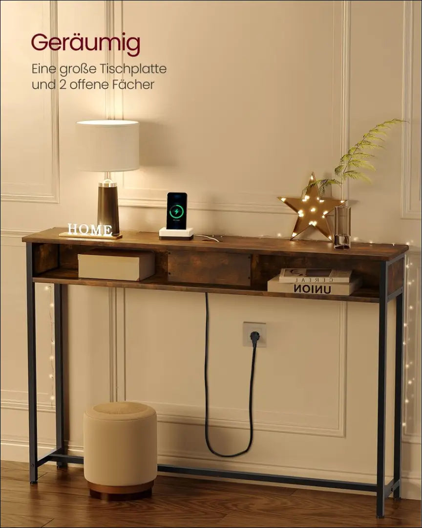 Šis plonas konsolės staliukas yra puikus pasirinkimas tiems, kurie nori suderinti funkcionalumą ir stilių. Konsolė yra sukurta taip, kad būtų ne tik estetiškai patraukli, bet ir praktiška. Su 2 kintamosios srovės lizdais ir 2 USB prievadais, šis stalas leidžia vienu metu įkrauti lempą, telefoną, planšetinį kompiuterį ir žaidimų konsolę.