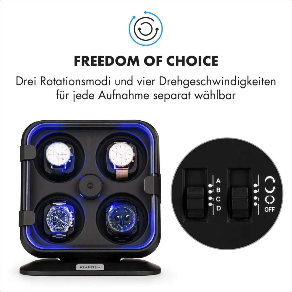 Tikslumas – ne sėkmės reikalas! „Klarstein Clover“ laikrodžių prisukimo mechanizmas buvo kruopščiai sukurtas taip, kad atitiktų specifinius automatinių laikrodžių priežiūros reikalavimus, ir suteikė jam elegantišką išvaizdą. „Klarstein Clover “ laikrodžių prisukimo mechanizmas padeda išsaugoti ir patraukliai eksponuoti automatinius laikrodžius. Keturios besisukančios platformos vienu metu talpina keturis chronografus, užtikrindamos reikiamą sukimąsi, kad mechanizmai veiktų nuolat, net kai jų nenešiojate. Tuo pačiu metu laikrodžiai pateikiami stilingai. Turėdami keturis pasirenkamus sukimosi greičius ir atskirai reguliuojamą sukimosi kryptį, galite puikiai pritaikyti mechanizmą savo laikrodžiams. Automatiniai laikrodžiai nusipelno būti matomi! Elegantiškas „Klarstein Clover“ laikrodžių prisukimo mechanizmo dizainas tai atspindi. Smūgiams atsparus plastikinis korpusas su akrilinėmis durelėmis suteikia puikų laikrodžių vaizdą. Mėlyna LED lemputė juos gražiai apšviečia; “Klarstein”; Siuntimo pakuotė gali būti ne originali, prekė siunčiama pilnai arba dalinai surinkta; |