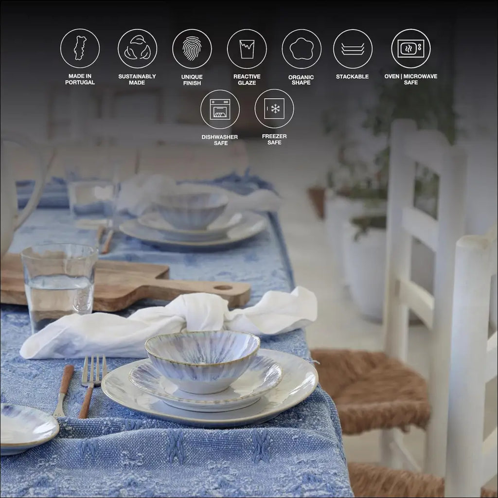 Šiltas rytų vėjelis ir Algarvės pakrantės kriokliai su vaisių aromatais ir gaiviais Ria Formosa kvapais įkvėpė šią kolekciją. Baltų ir mėlynų glazūrų bei organinių formų mišinys perteikia sudėtingą tarpeklių, kanalų, druskos lygumų ir smėlio paplūdimių, besidriekiančių per dykumų salas, kraštovaizdį; Tinka plauti indaplovėje, naudoti orkaitėje, mikrobangų krosnelėje ir šaldiklyje; “Costa Nova”; Siuntimo pakuotė gali būti ne originali, prekė siunčiama pilnai arba dalinai surinkta; |