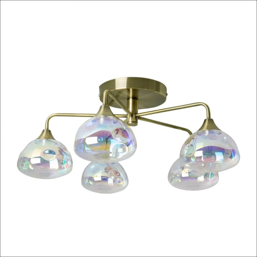 5 lempučių LED lubinis šviestuvas, pagamintas iš žalvario spalvos metalo ir stiklo; Integruoti šviesos diodai skleidžia malonią, šiltą baltą šviesą. (2925 K, 800 lm; 16,5 W); 2900K; IP20; Vaivorykštiniai stikliniai gaubtai sukuria stulbinantį šviesos, šešėlio ir vaivorykštės spalvų žaismą; “Nave”; Siuntimo pakuotė gali būti ne originali, prekė siunčiama pilnai arba dalinai surinkta; |