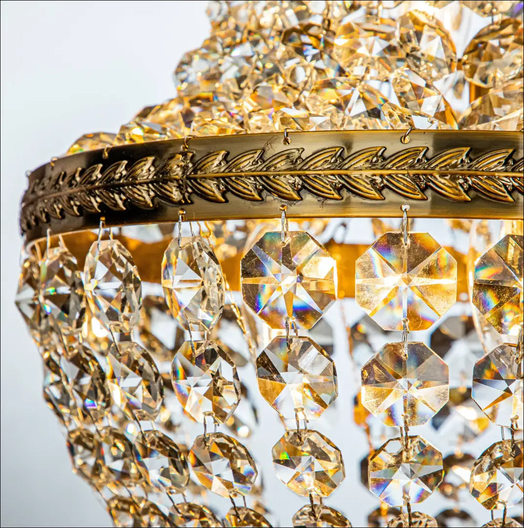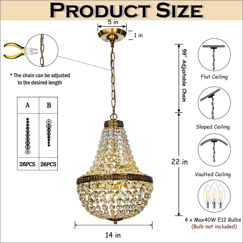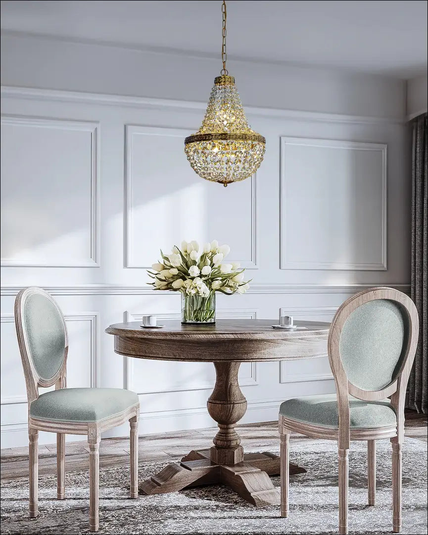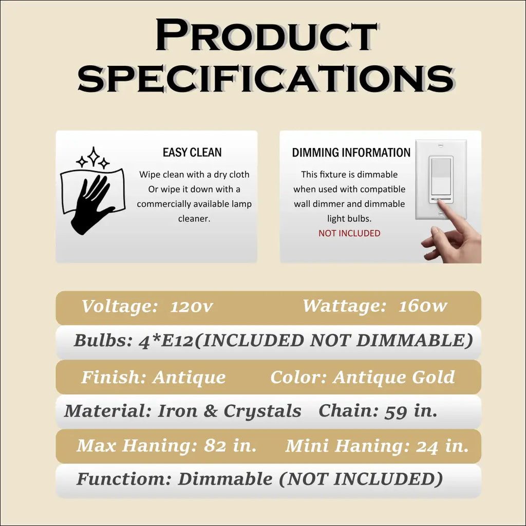 Šis krištolinis sietynas su sendinto aukso spalvos rėmeliu ir skaidriu krištolo karoliukais puoštu stovu sukuria paslaptingą, žavingą, vintažinio dizaino atmosferą. Jį sudaro dviejų pakopų rėmas su dekoratyviniais raižiniais ir rutulinė antgalis, pagamintas iš metalo su sendinto vario apdaila. Įjungta šviesa sklinda per krištolines prizmes tolygiai, apšviesdama bet kokią erdvę grakščiai ir švelniai. Šis krištolinis sietynas idealiai tinka jūsų prieškambariui, svetainei, valgomajam, miegamajam, koridoriui ir kt.; 4 vnt x 40W, E14 (lemputės nepridedamos); “Aloadecor”; Siuntimo pakuotė gali būti ne originali, prekė siunčiama pilnai arba dalinai surinkta; |