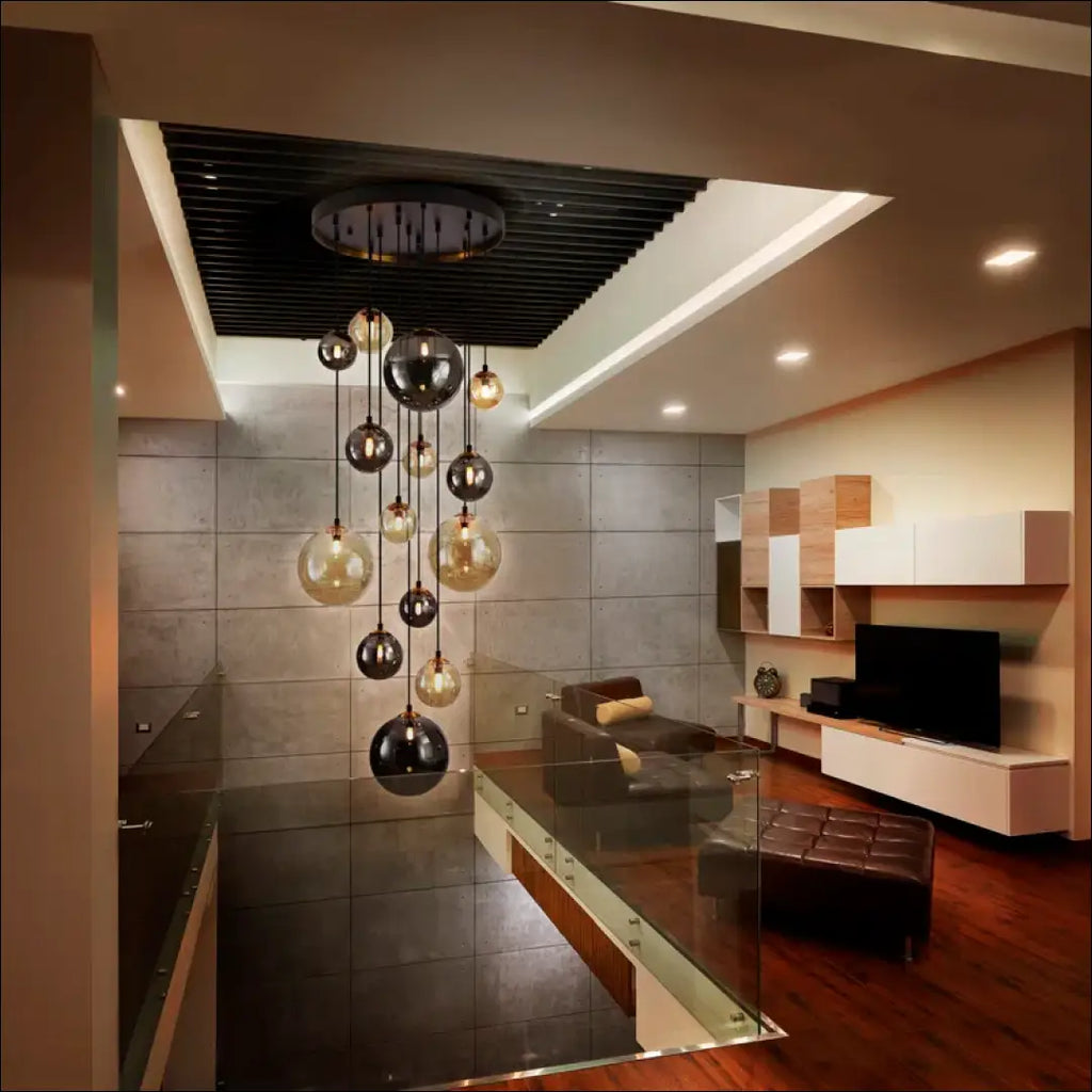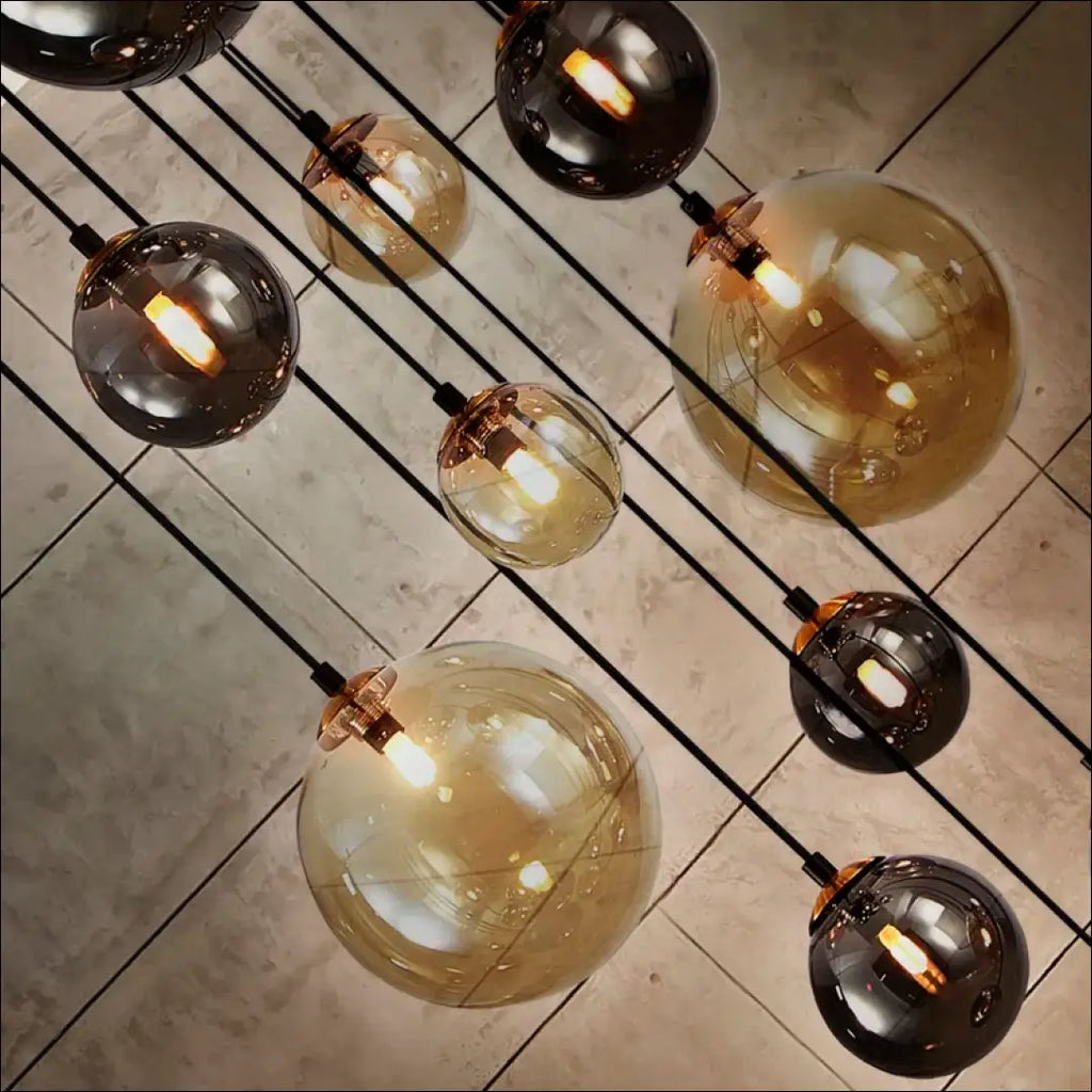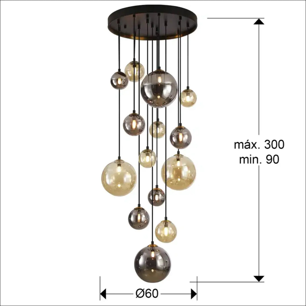 14 lempučių šviestuvas, matinės juodos spalvos su atlasinio žalvario detalėmis. Sferiniai 10, 12 ir 20 cm stikliniai gaubtai su gintaro ir blizgančios dūmų pilkos spalvos apdaila. Reguliuojamo ilgio; 400 lm; 3000 tūkst.; Komplektacijoje yra 14vnt G9 LED 3.5W lemputės; IP20; “Schuller”; Siuntimo pakuotė gali būti ne originali, prekė siunčiama pilnai arba dalinai surinkta; |