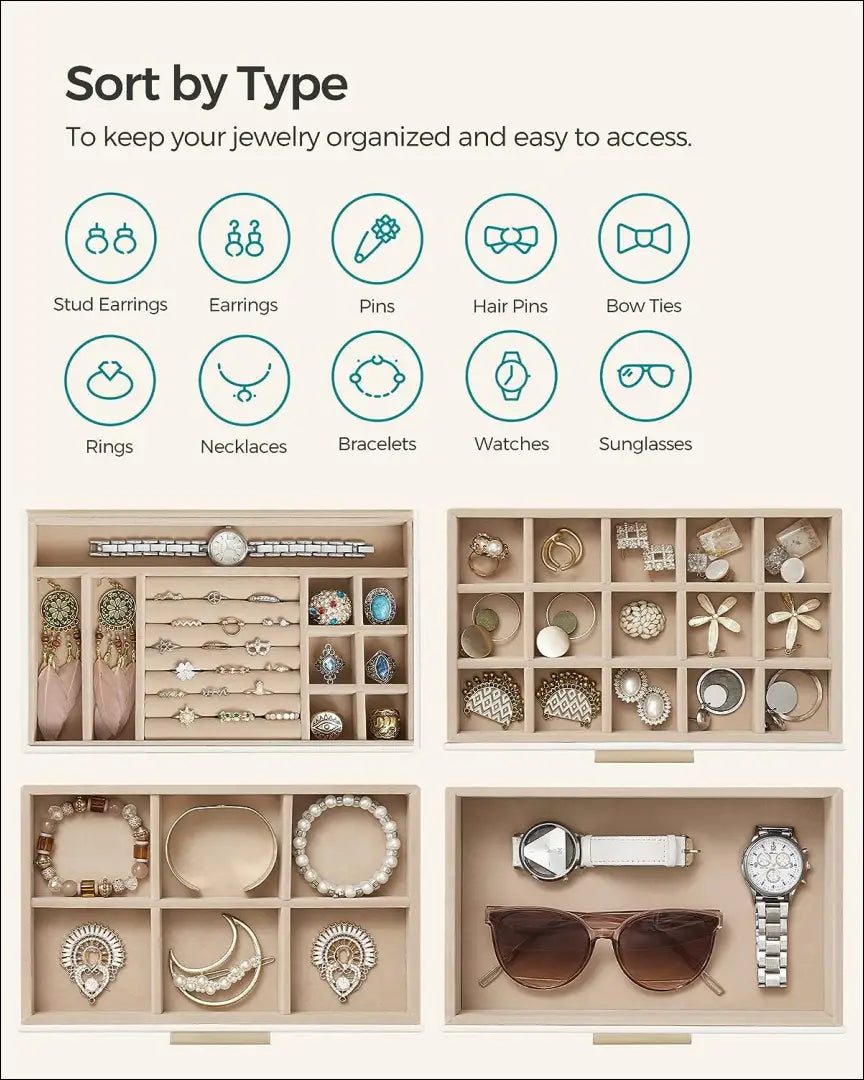 Šios papuošalų dėžutės viršutinės trys pakopos turi įvairių dydžių skyrelius, kuriuose galite tvarkingai laikyti mažus papuošalus. Dideliems aksesuarams, tokiems kaip akiniai nuo saulės ar laikrodžiai, skirtas erdvus apatinis stalčius.
