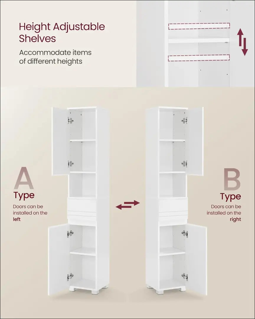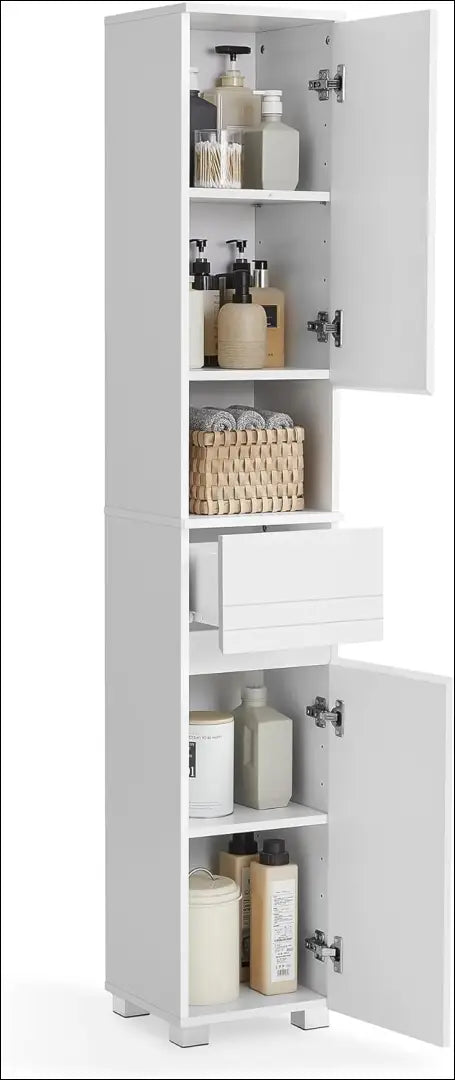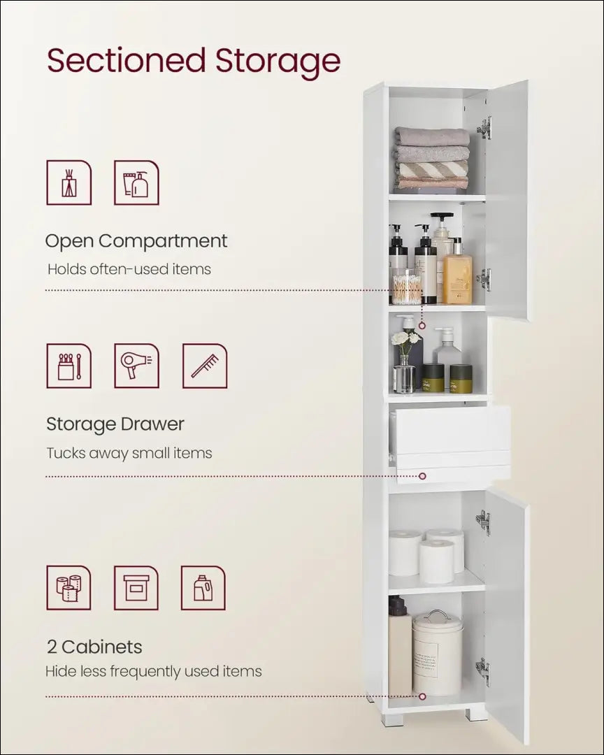 Rūšiuota saugykla: Mūsų plonoje vonios kambario spintelėje yra viršutinės ir apatinės spintelės, lentynos ir stalčiai. Siūlomi trijų tipų laikymo sprendimai šešiuose skyriuose daiktams laikyti pagal tipą.