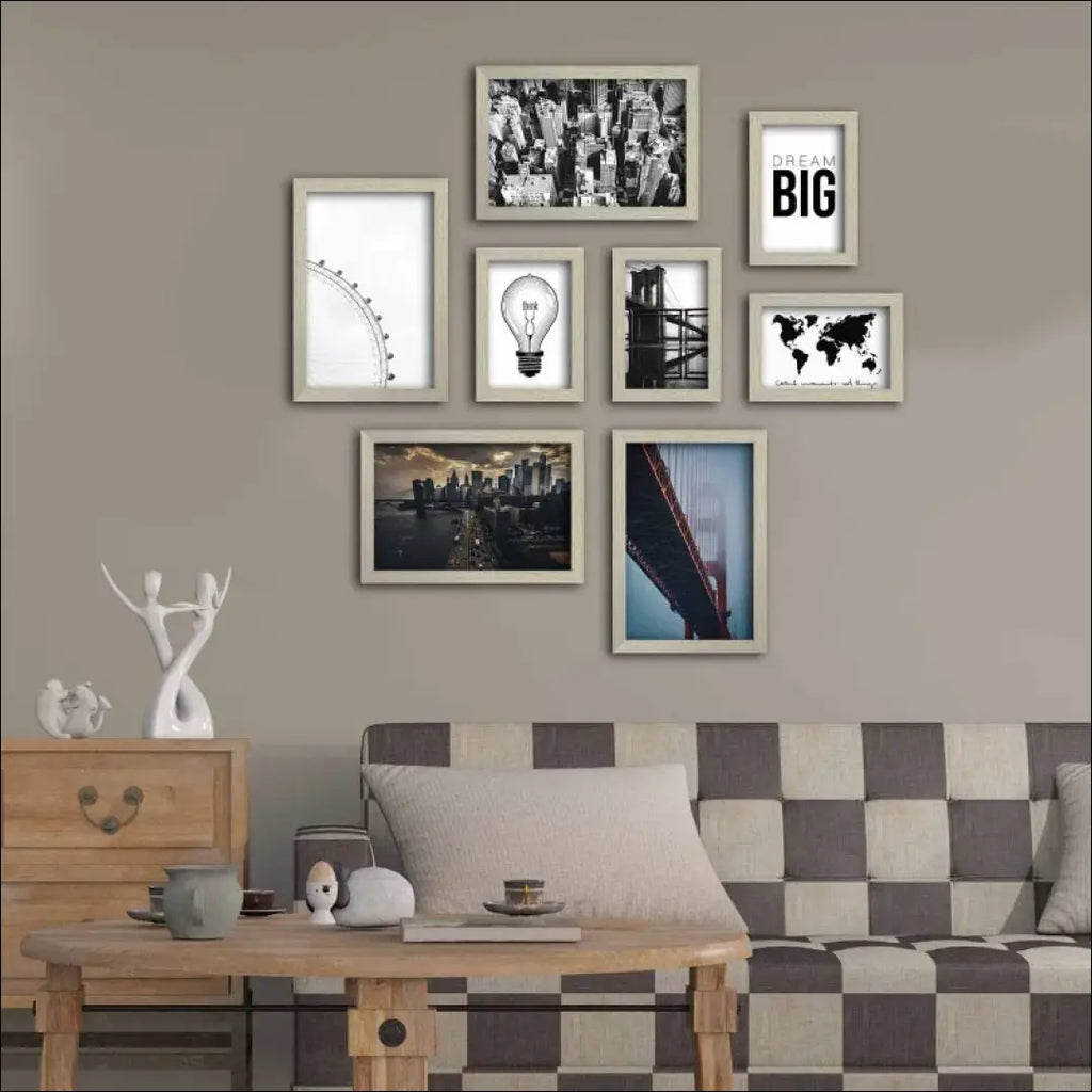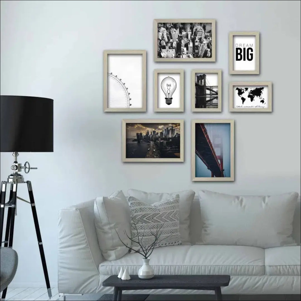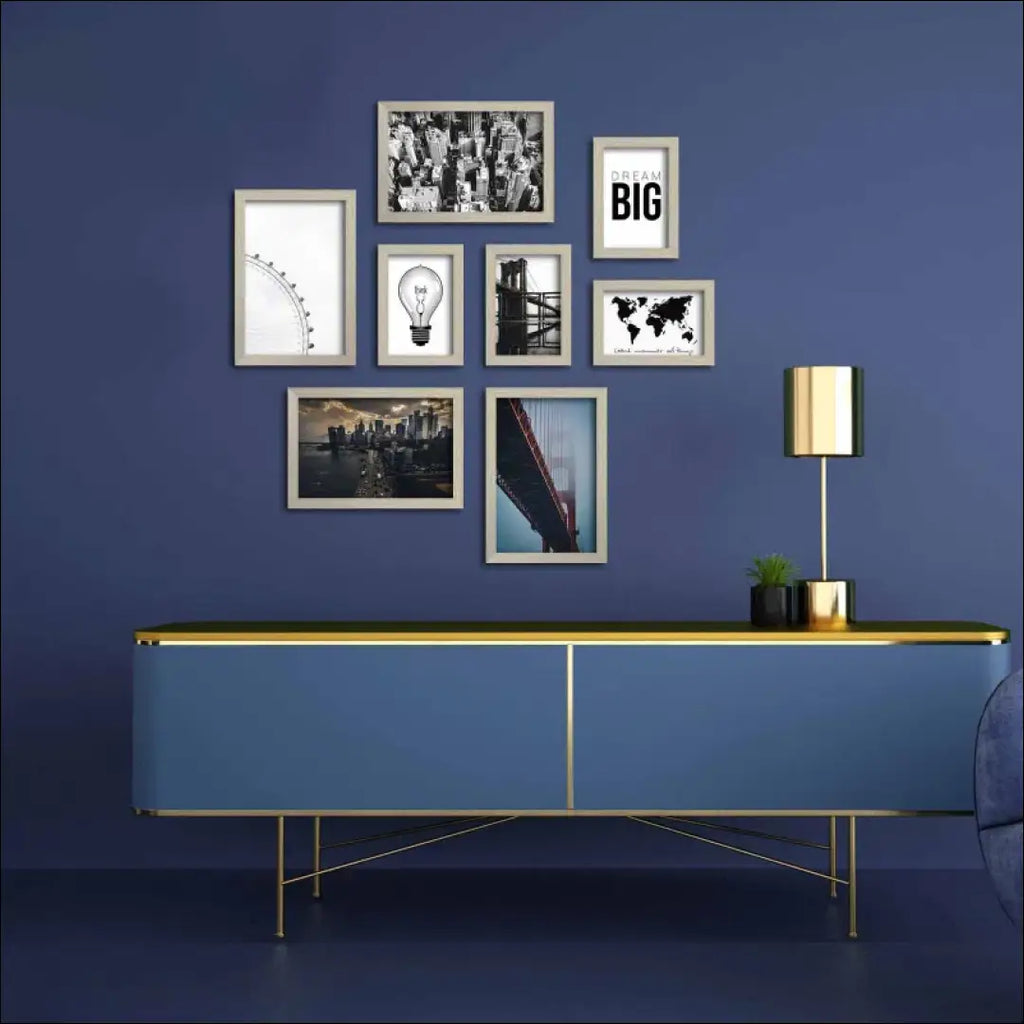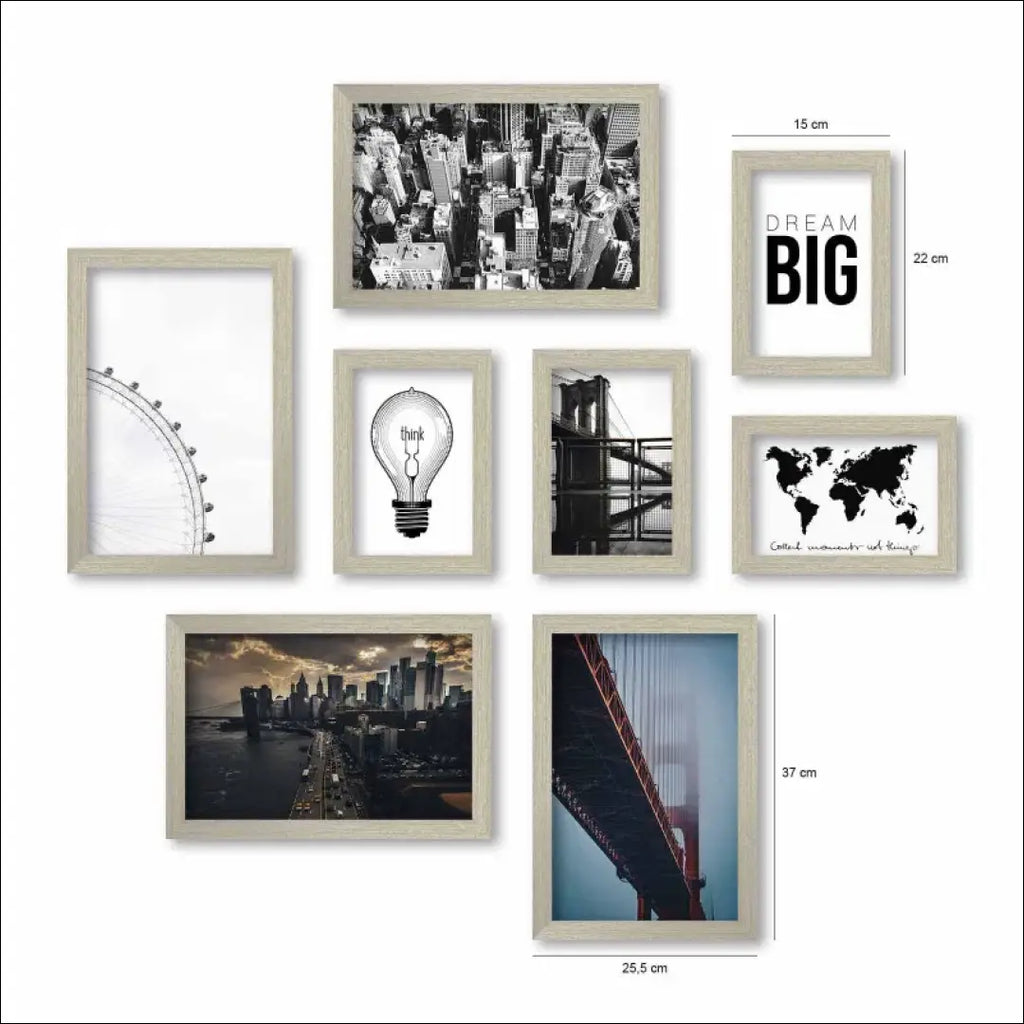 8 paveikslėlių rinkinys su įvairiais miesto peizažais ir frazėmis, su kreminės, auksinės spalvos rėmeliu; Pagaminti iš 3 mm storio MDF plokštės, su plastikiniu rėmu; “Ebern Designs”; Siuntimo pakuotė gali būti ne originali, prekė siunčiama pilnai arba dalinai surinkta; |