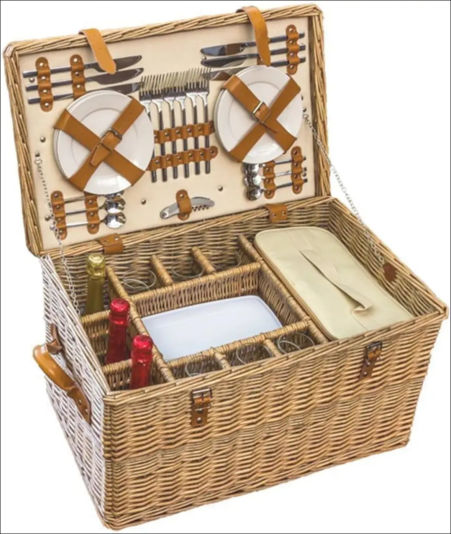 Blizgančio gluosnio spalvos rinkinys su 2 odiniais dirželiais, 2 šoninėmis rankenomis ir vyriais, 6 nerūdijančio plieno peiliais, šakutėmis ir šaukštais, 6 porcelianinėmis lėkštutėmis (17 cm) ir 6 šampano taurėmis, nuimama šalto vandens skyriumi, 3 vyno skyriais, butelių atidarytuvu ir 4 plastikinėmis maisto dėžutėmis; “Red Hamper”; Siuntimo pakuotė gali būti ne originali, prekė siunčiama pilnai arba dalinai surinkta; |