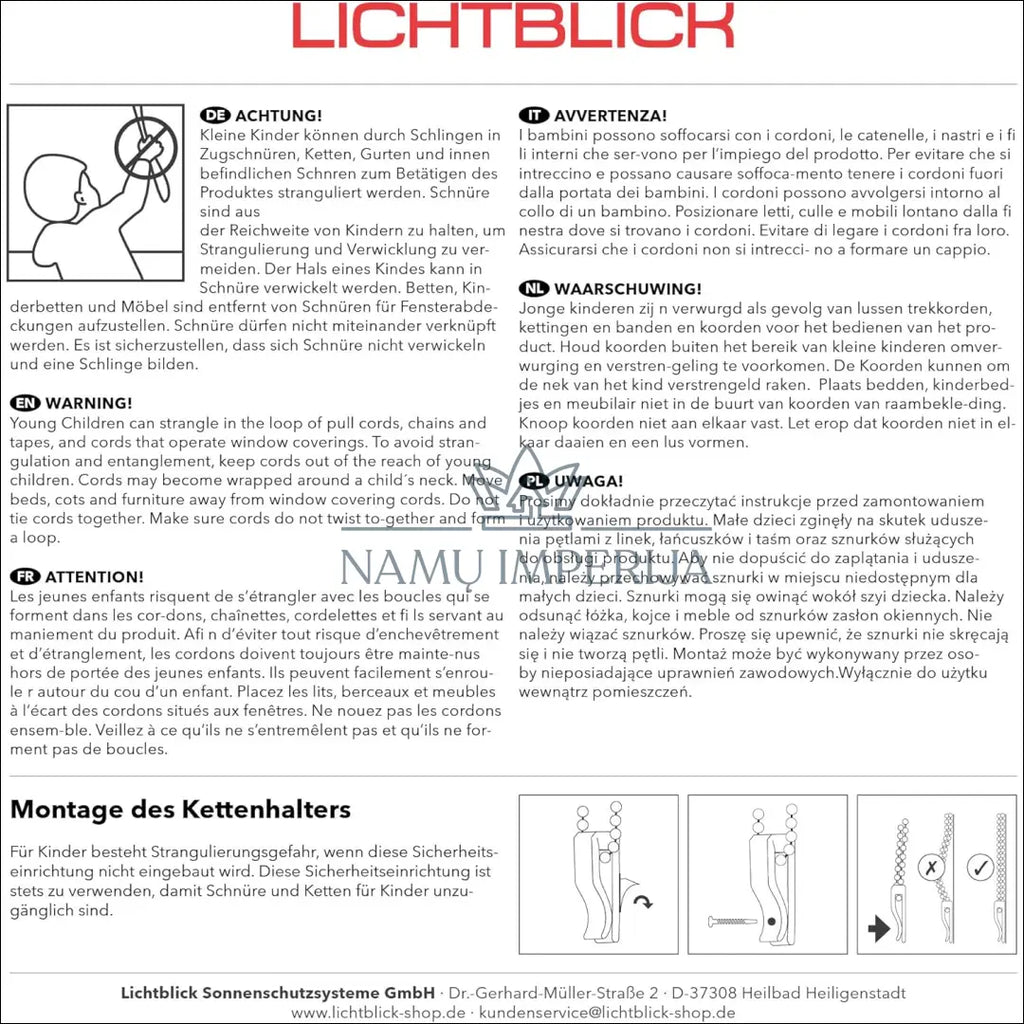 Įspūdingi 3D efektai ir raštai dėl perdengimo; Apsauga nuo privatumo ir saulės gali būti reguliuojama individualiai, nepermatoma ir permatoma; Greitas ir paprastas montavimas be gręžimo naudojant pridedamą reguliuojamą spaustuką; Valdymo pusė laisvai pasirenkama (iš anksto surinktą grandininį keltuvą galima montuoti kairėje arba dešinėje); Roletas gali būti reguliuojamas bet kokiam aukščiui, dvigubas roletas su žaliuzės funkcija; “Lichtblick”; Siuntimo pakuotė gali būti ne originali, prekė siunčiama pilnai arba dalinai surinkta; |