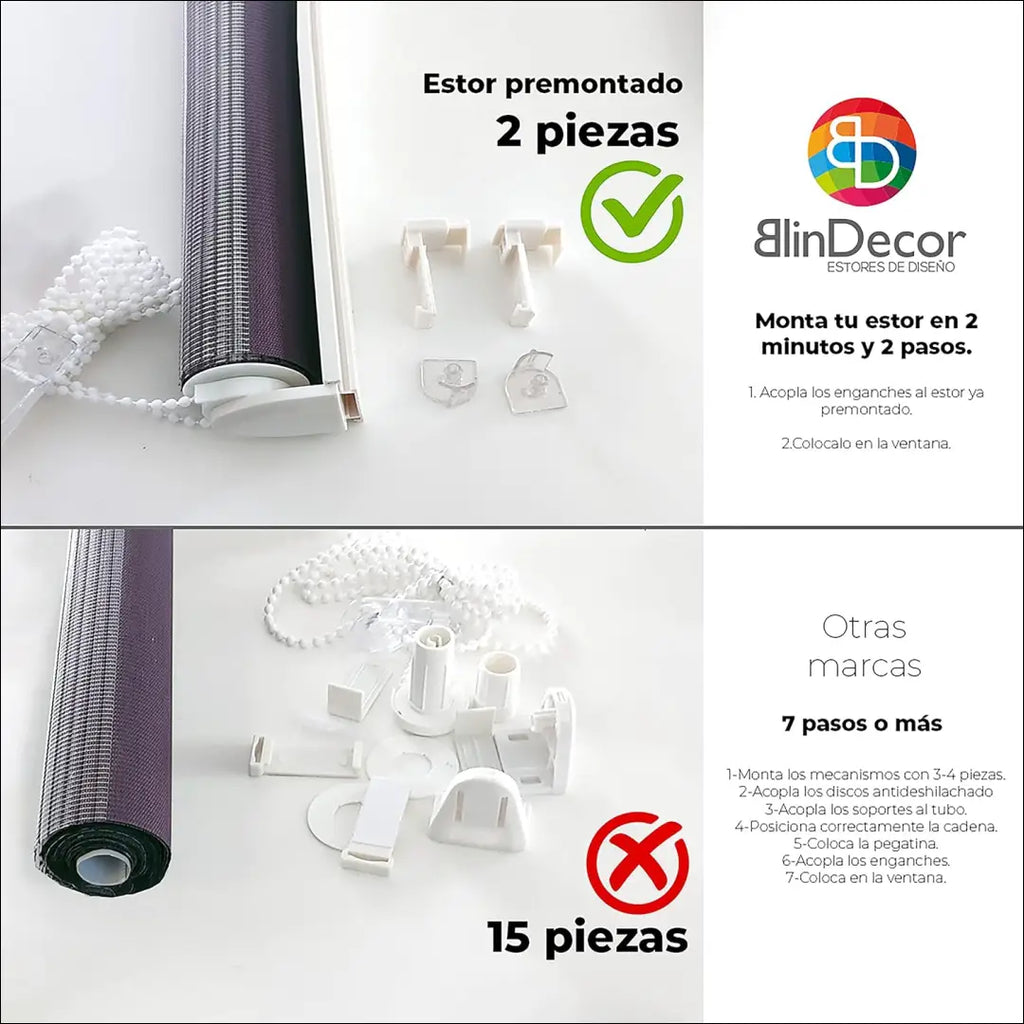 Blindecor Zeus Easy Fix žaliuzių modelis leidžia lengvai surinkti nenaudojant įrankių ar gręžimo. Jo montavimas yra su klijais arba spaustukais ant lango rėmo; Vienspalvės nepermatomo audinio žaliuzė. Ji visiškai blokuoja šviesos patekimą, nepraleisdamas saulės, ir apsaugo nuo UV spindulių. Ištobulinti gamybos procesai ir jo sudėties kokybė daro jį itin patvariu laikui bėgant; Baltas PVC mechanizmas ir grandinėlė, reguliavimas grandinės mechanizmu su vaikų sauga; “Blindecor”; Siuntimo pakuotė gali būti ne originali, prekė siunčiama pilnai arba dalinai surinkta; |