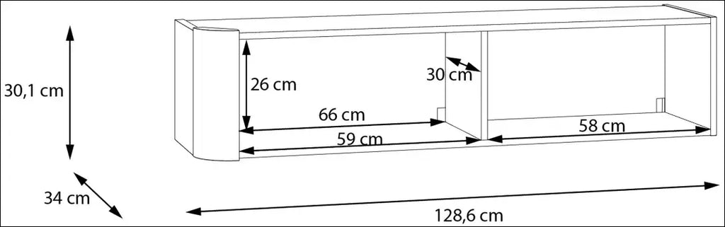 30,1 cm aukštis x 128,6 cm plotis x 34 cm gylis |