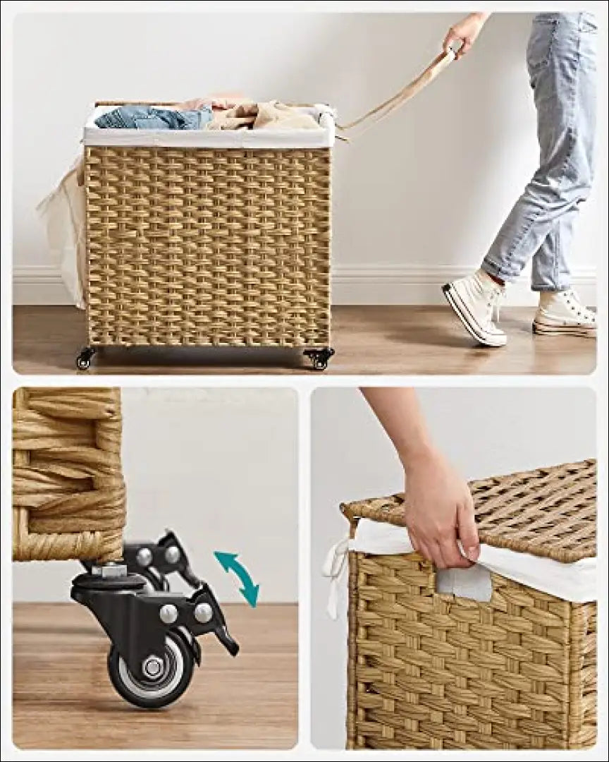 - Lengva perkelti: Skalbinių krepšelis turi 4 ratus (4 su stabdžiais), todėl, jei reikia, galite jį perkelti arba laikyti vietoje. Ratai taip pat gali būti pakeisti pėdomis; taip pat pridedama ilga diržo rankena, skirta jį perkelti.
