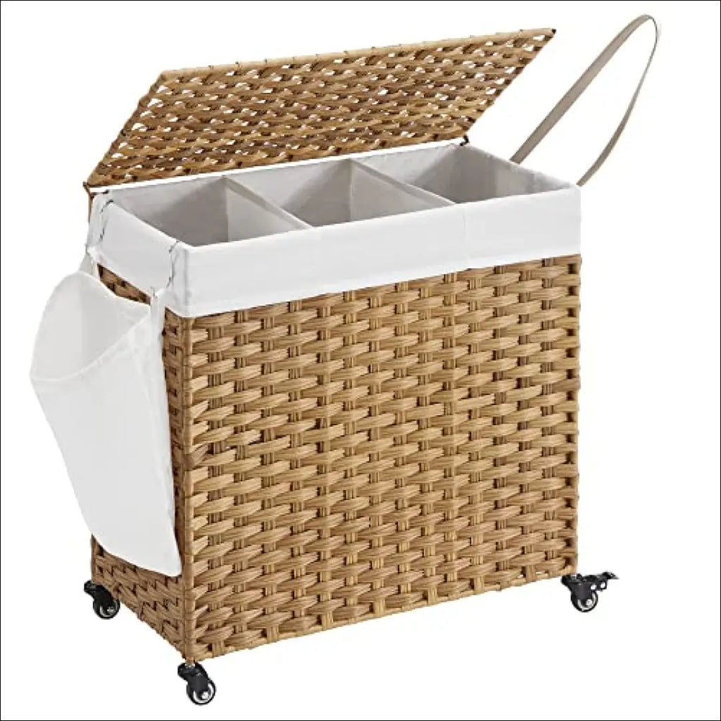 - Didelė talpa, 3 skyriai: Krepšio dydis yra 66 x 33 x 60 cm, o jo talpa yra 140 L. 3 skyriai padeda rūšiuoti šviesius, tamsius ir gležnus drabužius, kad juos būtų lengva valyti ir laikyti.