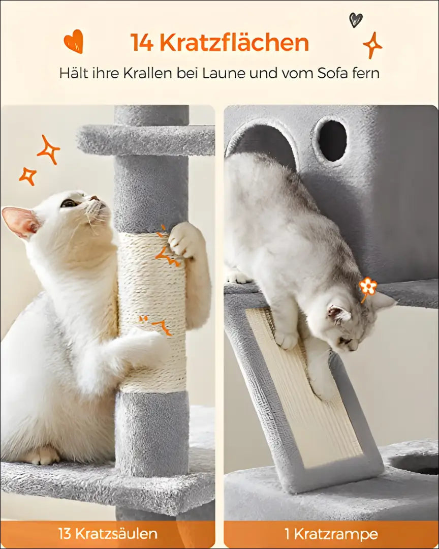 Su 13 įbrėžimų stulpeliais ir 1 draskymo rampa, jūsų katės galės kasytis ir išleisti energiją, nekenkdamos jūsų baldams. Braižymo rampa taip pat veikia kaip kopėčios, padedančios kačiukams ir pagyvenusioms katėms lengvai lipti į viršų.