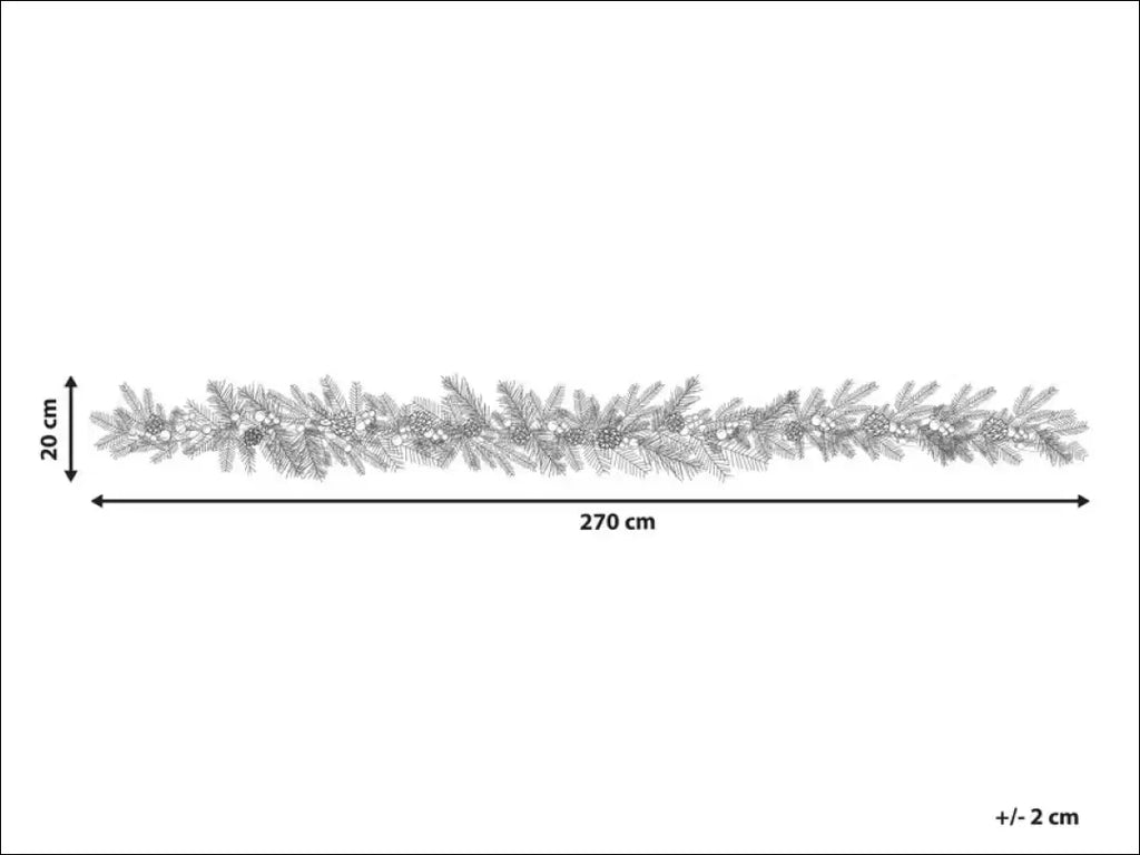 Dirbtinė dekoratyvinė girlianda su dirbtiniu sniegu, pušies kankorėžiais ir uogomis. Girlianda pagaminta iš sintetinės medžiagos ir nereikalauja ypatingos priežiūros, kad daugelį metų tarnautų savo paskirtį. Eglės girliandoje yra LED lemputės, dekoratyviniai kankorėžiai ir dirbtinės spanguolės – derinys, kuris tikrai pritrauks dėmesį. Šios kalėdinės dekoracijos šakas galima stilizuoti ir pritaikyti pagal pageidavimą. Kadangi gaminys veikia su baterijomis (baterijos nepridedamos), jo nereikia jungti prie elektros lizdo ir jį galima greitai išjungti jungikliu; “Beliani”; Siuntimo pakuotė gali būti ne originali, prekė siunčiama pilnai arba dalinai surinkta; |
