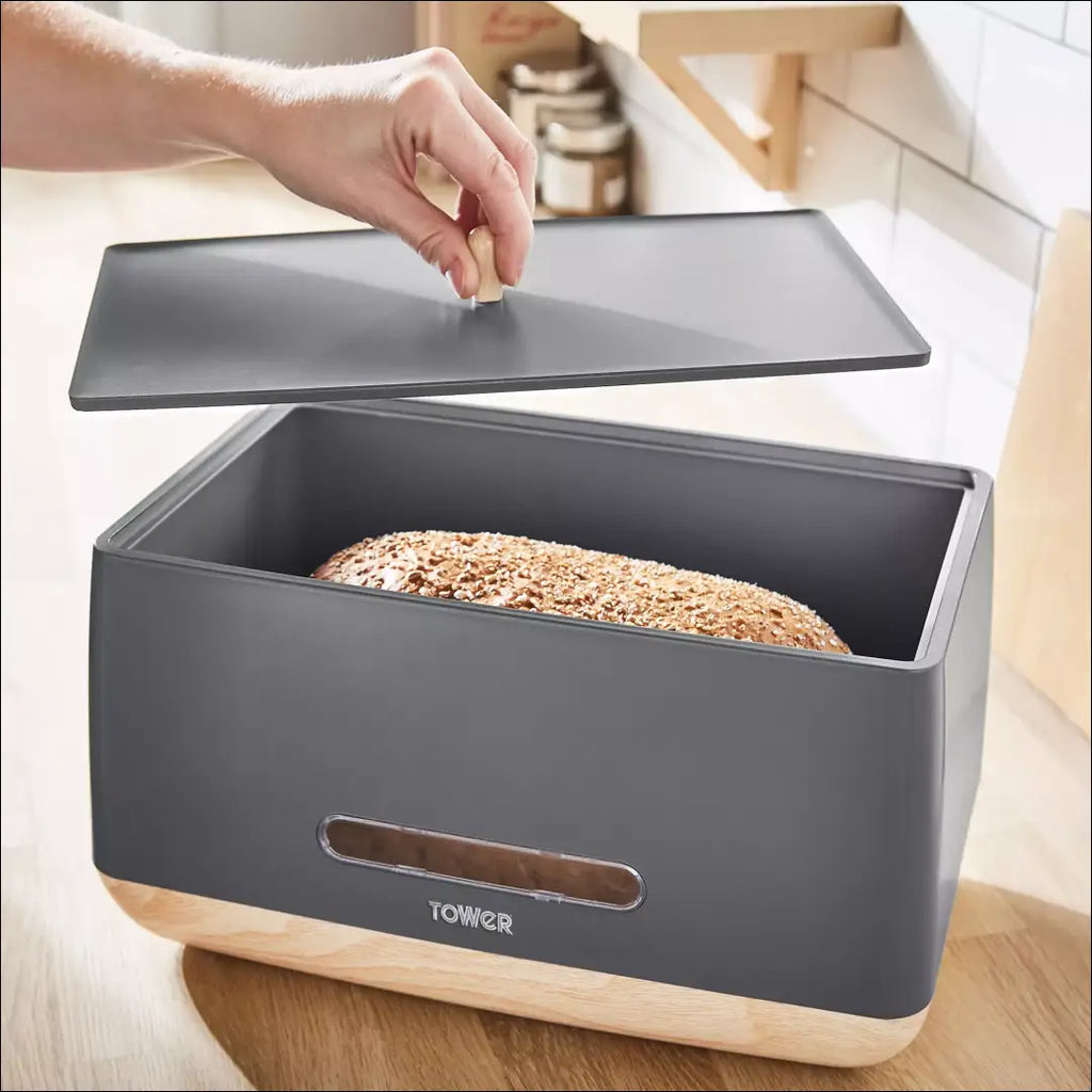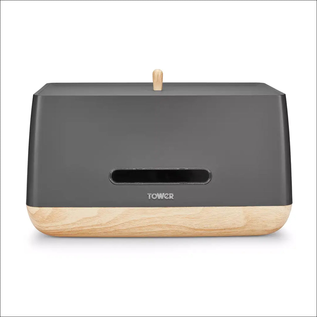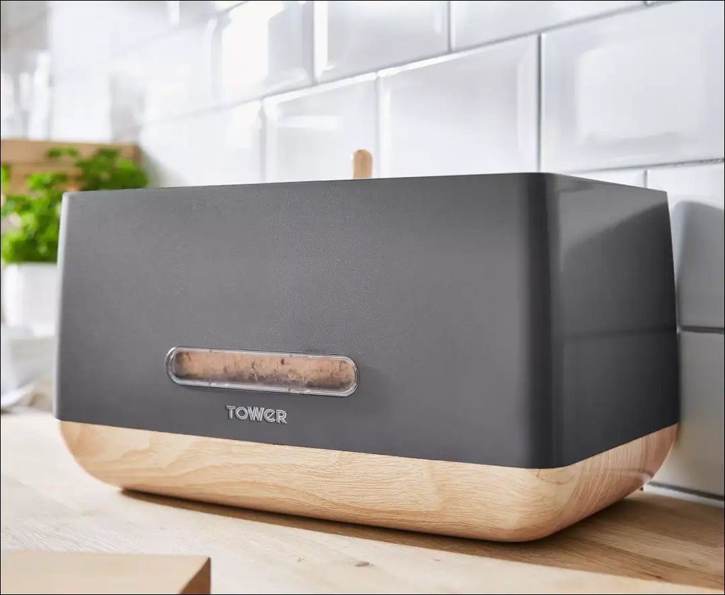 Šioje „Tower Scandi“ duoninėje tvarkingai laikykite savo kepinius. Tvirta konstrukcija padengta pilka matine apdaila, su medžio imitacijos pagrindu ir dangčio rankena, suteikiančia subtilų skandinavišką akcentą ir tinkančia įvairiam virtuvės interjerui. Visiškai nuimamas dėžės dangtis suteikia maksimalią prieigą, o per langelį galite bet kada peržiūrėti turinį; Jos pagrindas yra neslystantis, kad virtuvės stalviršis būtų stabilus, o norint išlaikyti nepriekaištingą skandinavišką apdailą, ją tereikia nuvalyti; “Tower Scandi”; Siuntimo pakuotė gali būti ne originali, prekė siunčiama pilnai arba dalinai surinkta; |