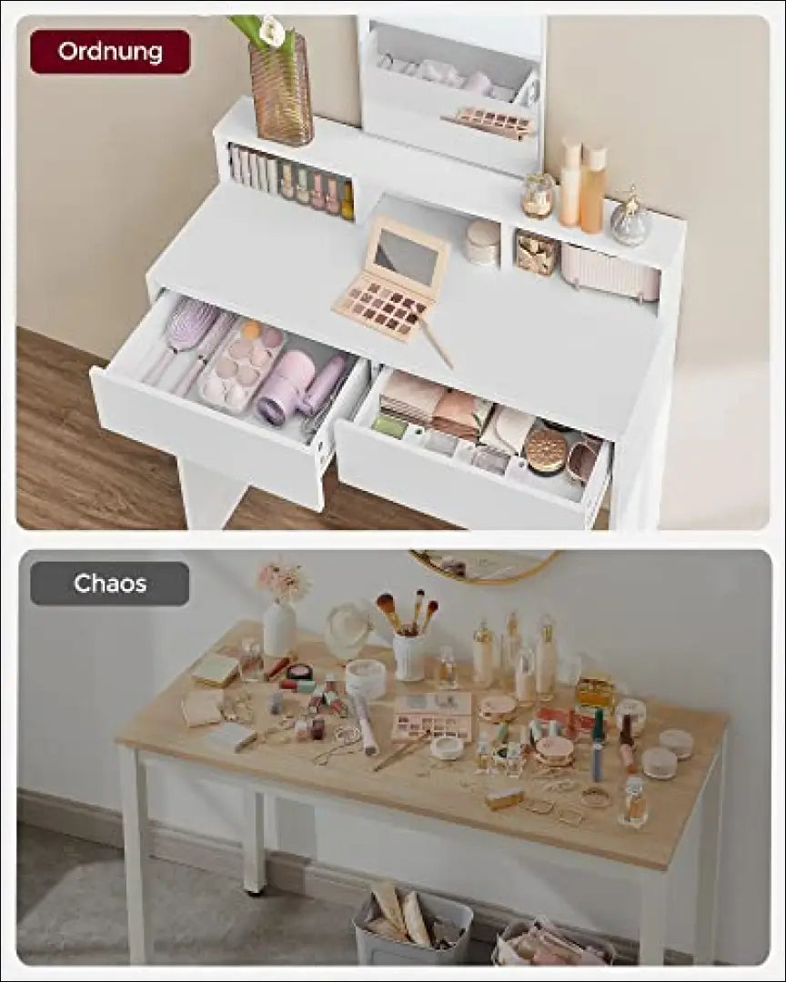 Этот косметический столик имеет 2 больших ящика, где можно хранить тени для век и пудру, и 3 открытых отделения для лака для ногтей. Духи стоят на возвышении, поэтому все легко доступно и аккуратно хранится. Современный дизайн и прямоугольное зеркало заставят вас улыбаться каждый раз, когда вы будете собираться перед этим косметическим столиком.