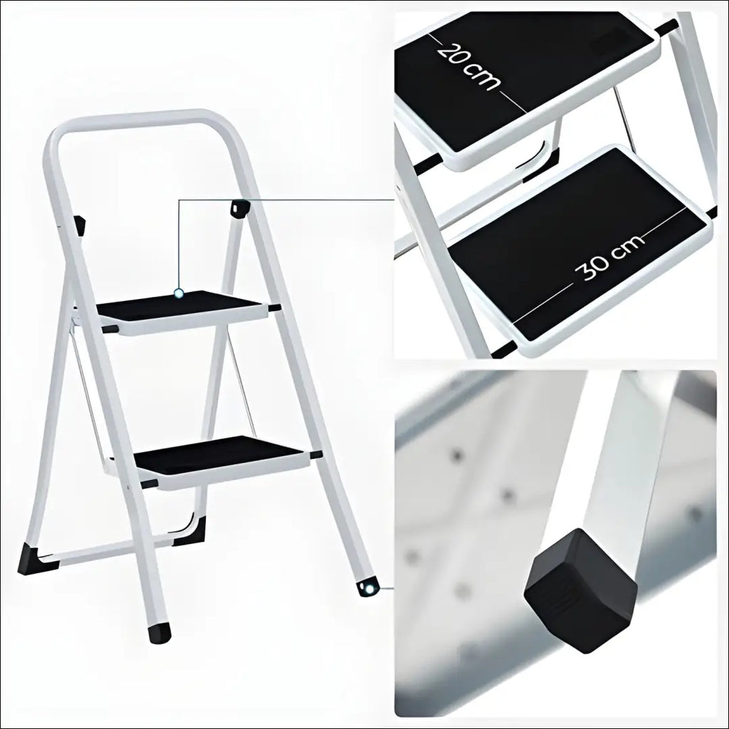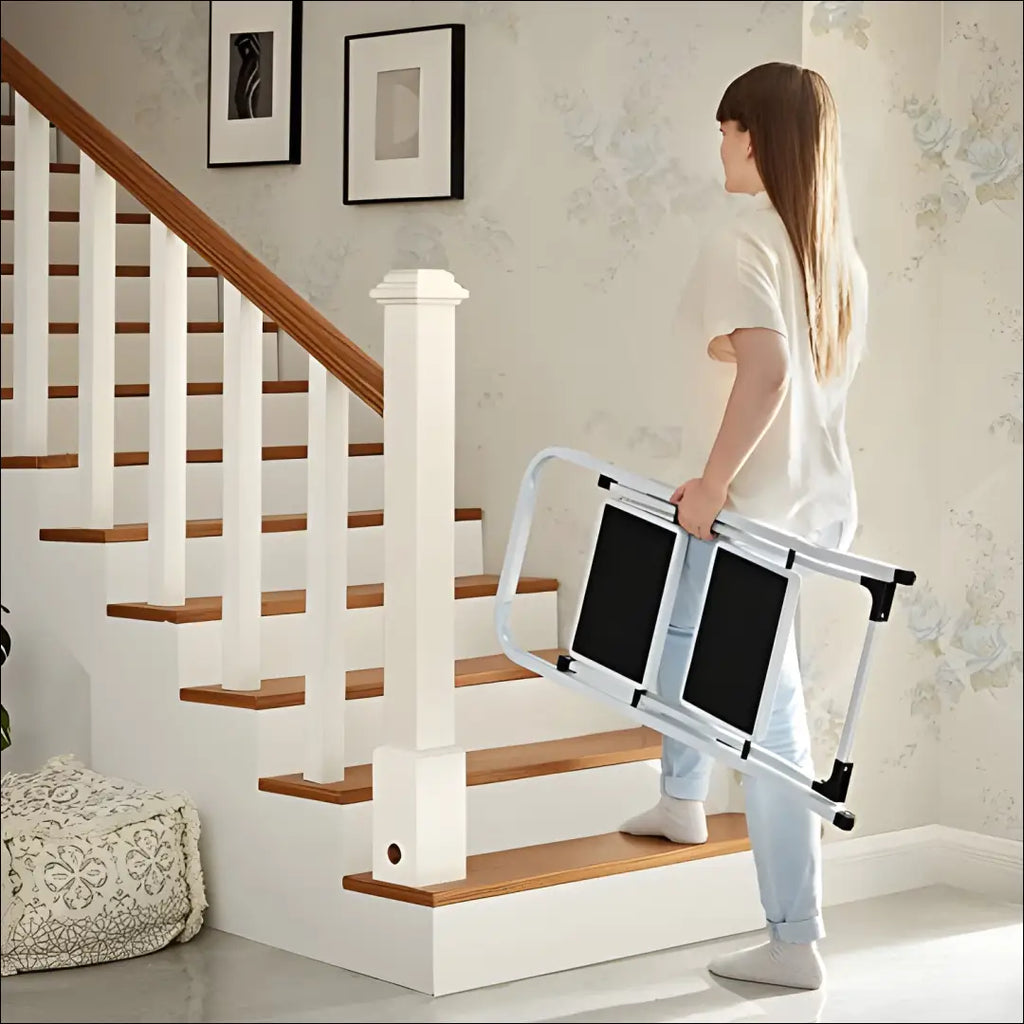 Сложенная лестница имеет ширину всего 4,5 см, что позволяет легко вставлять ее в углы или щели между стенами и шкафами. Благодаря одной ручке эту лестницу очень удобно переносить. Она идеально подходит для использования как дома, так и на работе — на кухне, в студии или перед высоким офисом.