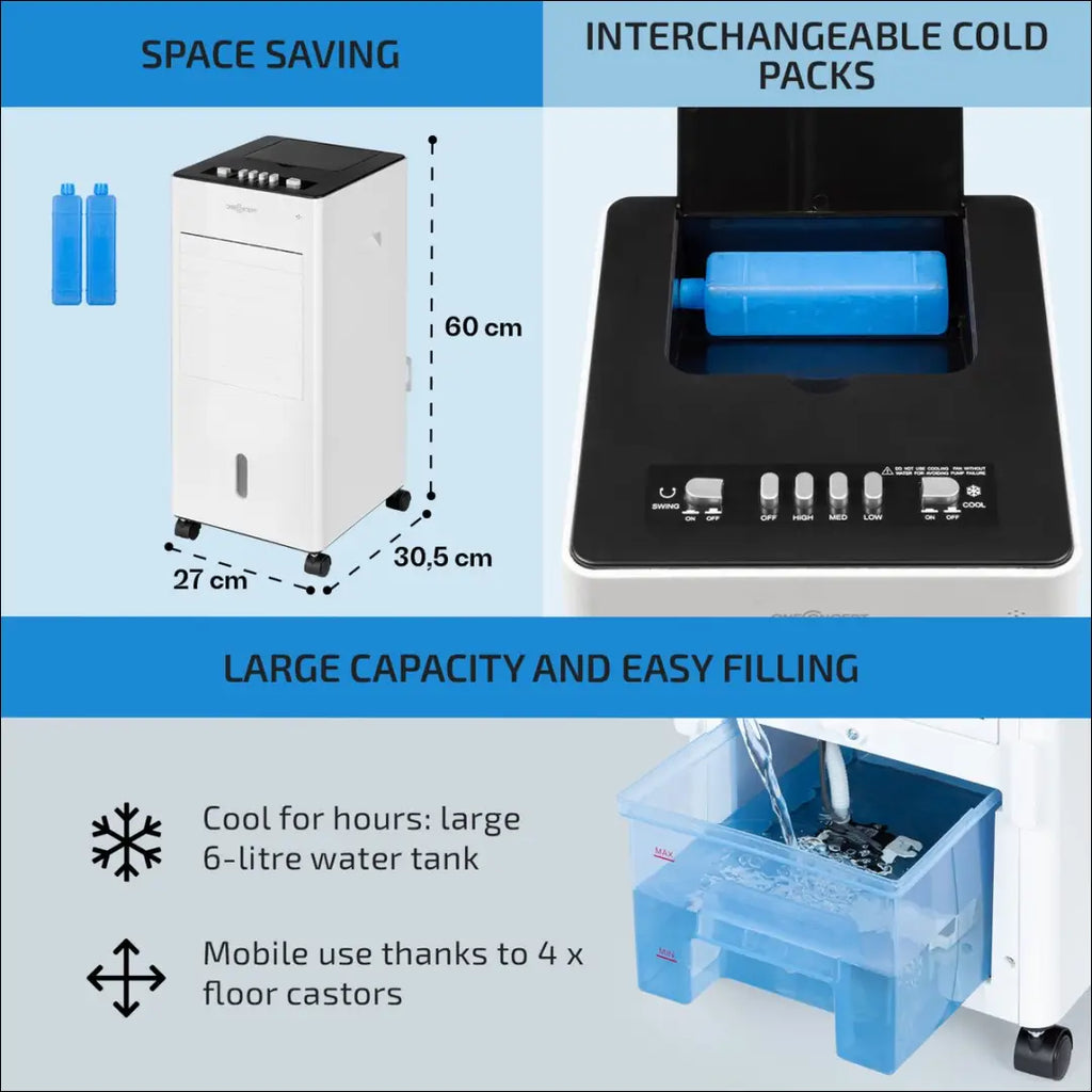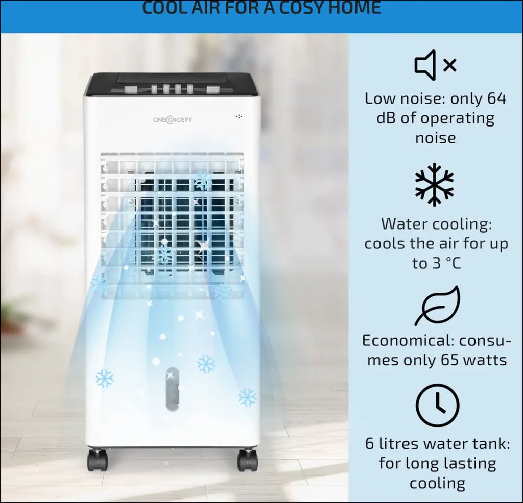 Тройное волшебство: охладитель воздуха oneConcept Freshboxx предлагает вашему дому эффективность 3-в-1 – вентилятор, охладитель воздуха и увлажнитель в одном устройстве. Приятная летняя свежесть, на которую определенно стоит обратить внимание. Благодаря мощному потоку воздуха 360 м³/ч, вентилятор oneConcept Freshboxx перемещает застоявшийся летний воздух, создавая приятное дуновение ветра на трех уровнях мощности. Дополнительная функция колебания также перемещает воздушный поток из стороны в сторону. В сочетании с охладителем воздуха воздушный поток еще больше охлаждается и обогащается приятной влажностью. Для этого 6-литровый фильтр испаряется через сотовый фильтр, а воздушный поток охлаждается естественным образом и энергосберегающе – воздушный поток превращается в направленный и приятный освежающий бриз, независимо от того, сидите ли вы за столом, на диване или в детской комнате. Два сменных охлаждающих змеевика в резервуаре для воды дополнительно усиливают охлаждающий эффект. Для удобства наполнения, очистки и опорожнения резервуар для воды можно полностью снять или наполнить сверху во время использования. Благодаря встроенным роликам охладитель воздуха можно перемещать куда угодно, и он сразу готов к использованию. Мощный и универсальный: охладитель воздуха oneConcept Freshboxx — это освежающее решение для любого жаркого дня в году; Максимальный уровень шума: 64 дБ; «Одна концепция»; Упаковка для транспортировки может быть не оригинальной, товар поставляется в полностью или частично собранном виде; |