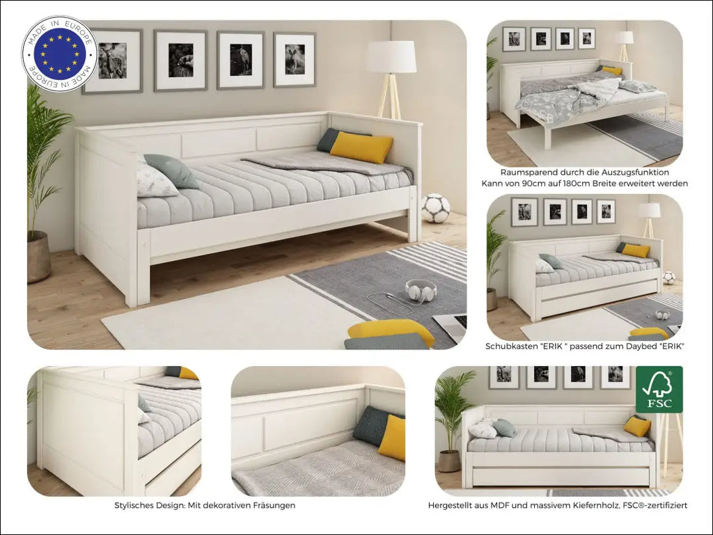 Ši praktiška ištraukiama lova idealiai tinka kaip patogi miegojimo vieta vaiko kambaryje arba kaip svečių lova. Prireikus ištraukiamas prailginimas praplečia miegojimo zoną, suteikdamas svečiams pilno dydžio dvigulę lovą. Paprastas dizainas pasižymi dekoratyviniais frezavimais ir sukuria maloniai ramią atmosferą poilsiui. Lova pagaminta iš FSC® sertifikuotos medžiagos ir komplektuojama su grotelių pagrindu. Išradingas sprendimas: praktiška ištraukiama lova – puikiai tinka kaip jaunuolio ar svečių lova; Keliamoji galia - 90 kg; Su grotelėmis, be čiužinio ir stalčiaus; “Brayden Studio”; Siuntimo pakuotė gali būti ne originali, prekė siunčiama pilnai arba dalinai surinkta; |