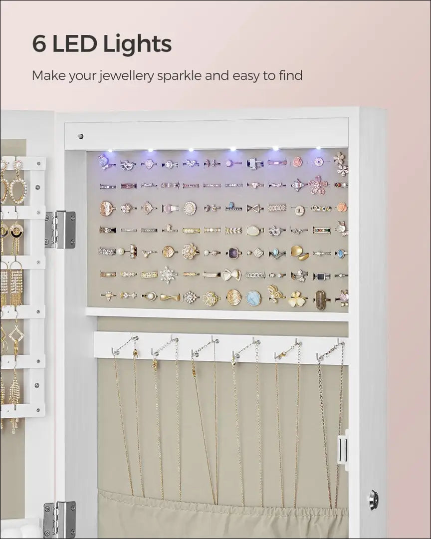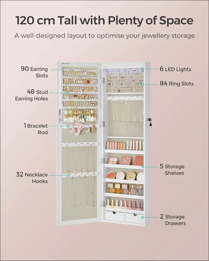 Этот шкаф для украшений отличается чистыми линиями и элегантной белой отделкой, которая придает ему ощущение роскоши. Внутри вы найдете 84 гнезда для колец, 90 слотов для сережек, 48 отверстий для гвоздиков, 32 крючка для ожерелий, 5 полок, 2 ящика и 1 держатель для браслетов. Это значит, что все будет на своем месте, и вы сможете легко найти свои любимые украшения.
