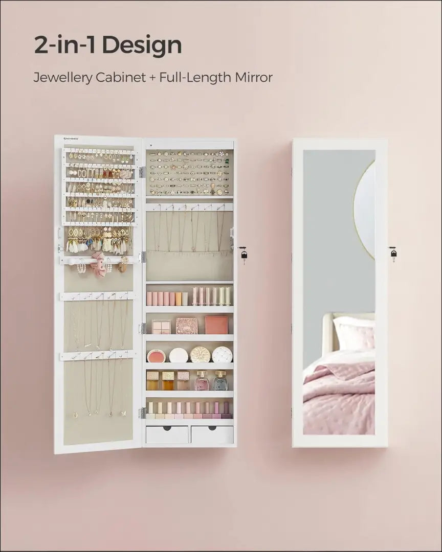 Шкафчик можно повесить на дверь или закрепить на стене, что экономит место и обеспечивает гибкость. Все необходимые кронштейны и винты включены в комплект для быстрой и легкой установки. Кроме того, замок безопасности с 2 ключами обеспечит сохранность ваших ценных украшений.