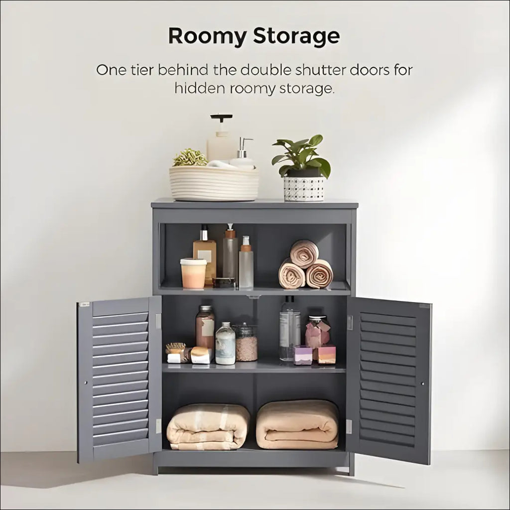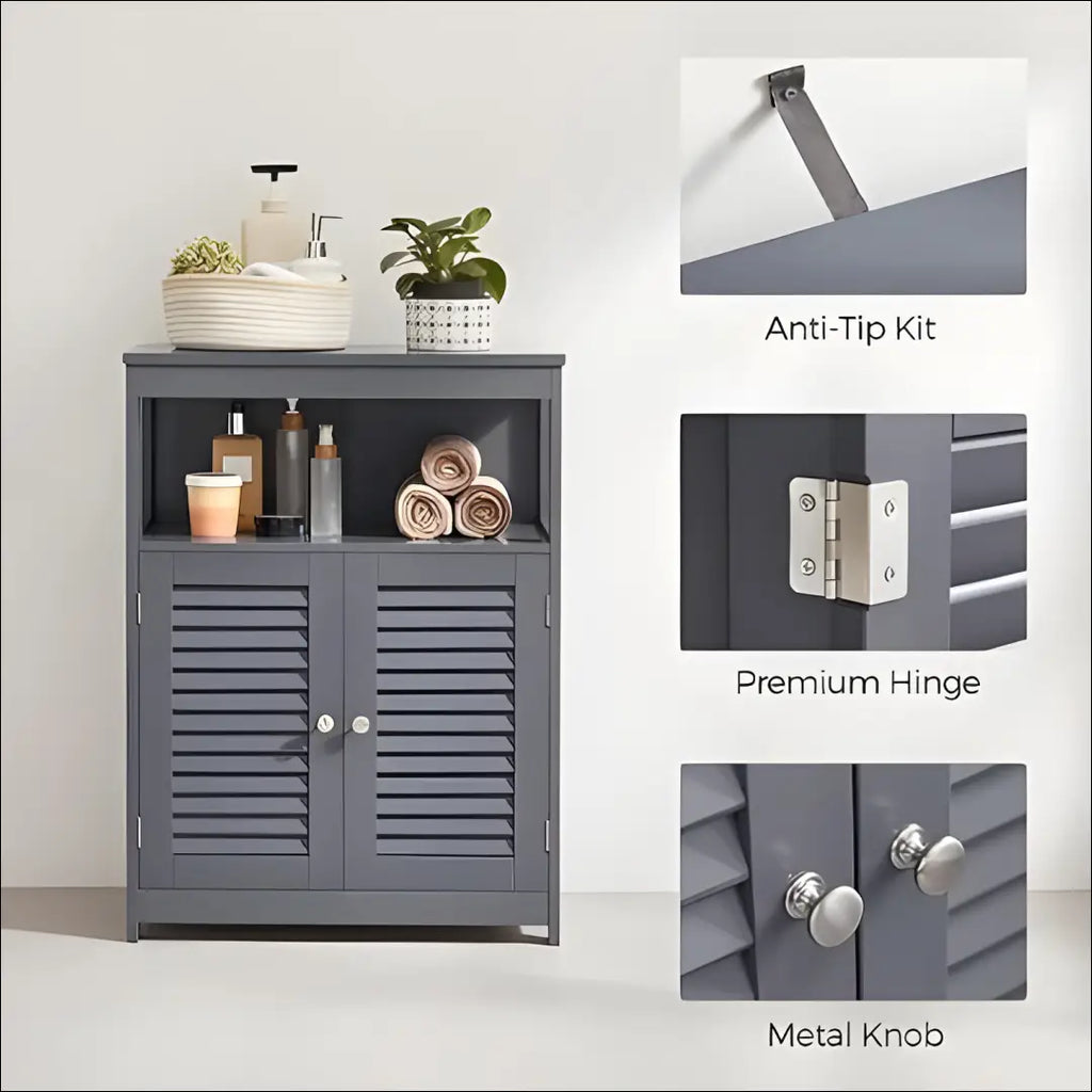 Откройте жалюзийные двери, чтобы увидеть просторный стеллаж с 3 вариантами высоты, где вы можете хранить чистые полотенца или дополнительную туалетную бумагу. Открытый отсек наверху идеально подходит для часто используемых предметов, а верхняя поверхность идеально подходит для духов или косметических средств.
