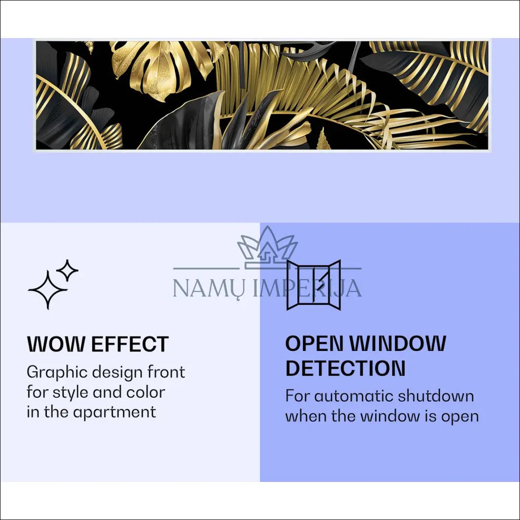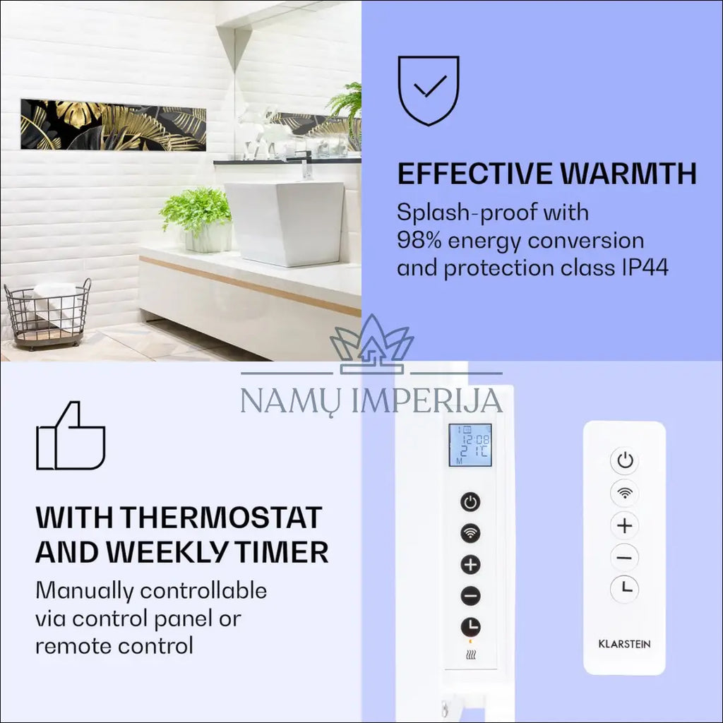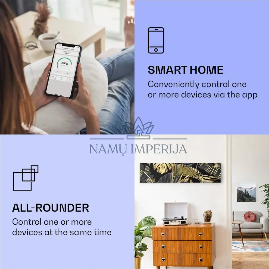 „Klarstein Air Art Smart“ infraraudonųjų spindulių šildytuvas sujungia itin efektyvų šildymo našumą su patraukliu dizainu ir pažangiausiomis technologijomis. Jis suteikia jaukią šilumą, naują spindesį ir naujas spalvas bet kuriam kambariui, o dėl infraraudonųjų spindulių technologijos yra itin energiją taupantis ir ekologiškas. Turėdamas galingą 350 vatų galią ir IR „ComfortHeat“, jis skleidžia odai labai malonią šilumą, kuri tiksliai paskirstoma šalia esantiems. Lengvai valdykite vieną ar kelis šildytuvus išmaniuoju telefonu, nuotolinio valdymo pultu arba klaviatūra; Malonus kaip saulė: IR komforto šildymas šildo jus, jūsų baldus ir sienas sveikais infraraudonaisiais spinduliais; Šildo be ventiliatoriaus: idealiai tinka alergiškiems žmonėms ir triukšmui jautrioms vietovėms Vau efektas: grafinio dizaino priekis stiliui ir spalvoms jūsų namuose; Atspari vandeniui technologija: 98 % energijos konversija ir IP44 apsaugos klasė; Su termostatu ir savaitiniu laikmačiu: visiškai rankiniu būdu valdomas valdymo skydeliu su LCD ekranu arba nuotolinio valdymo pultu; Atviro lango aptikimas : automatiškai išsijungia atidarius langą; “Klarstein”; Siuntimo pakuotė gali būti ne originali, prekė siunčiama pilnai arba dalinai surinkta; |
