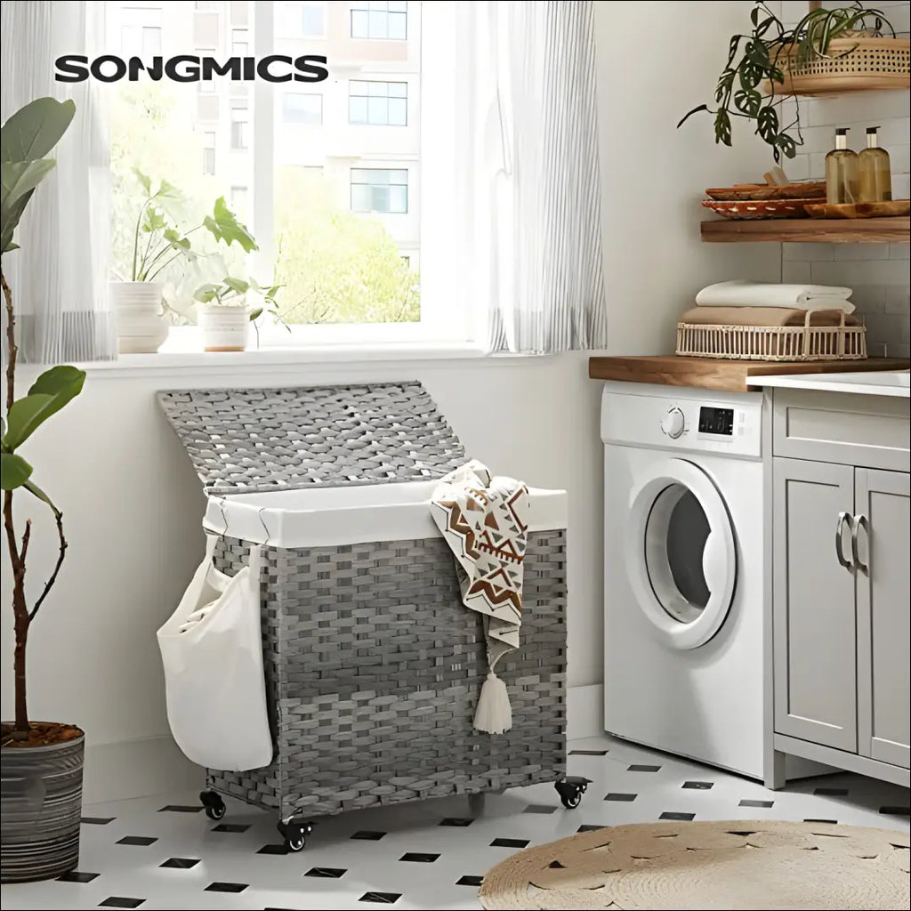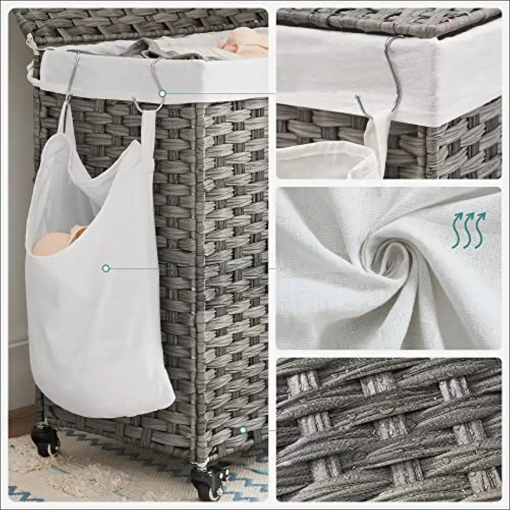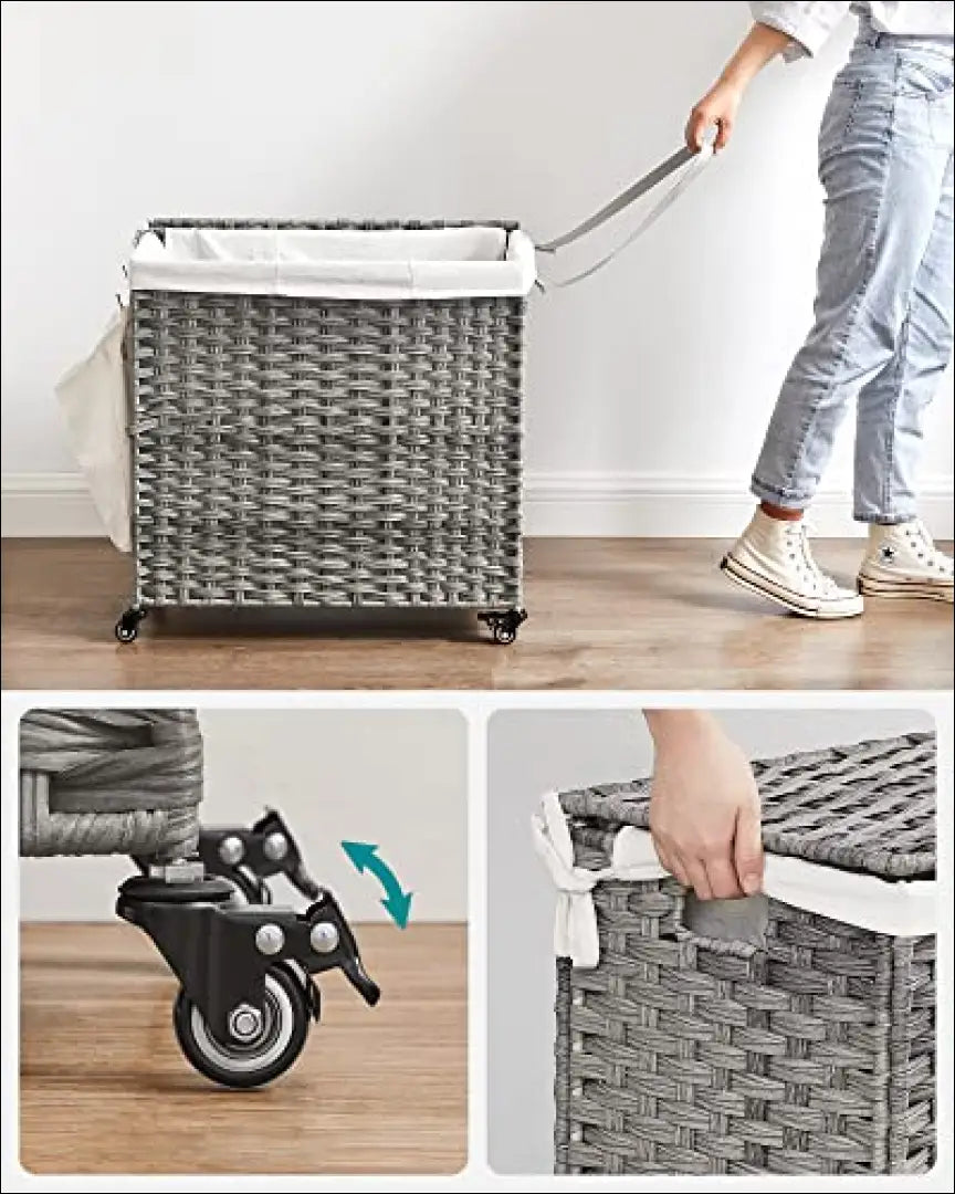 - Большая вместимость, 3 отделения: Размер корзины составляет 66 x 33 x 60 см, а ее объем — 140 л. Система из трех отделений помогает сортировать одежду для легкой чистки и хранения.