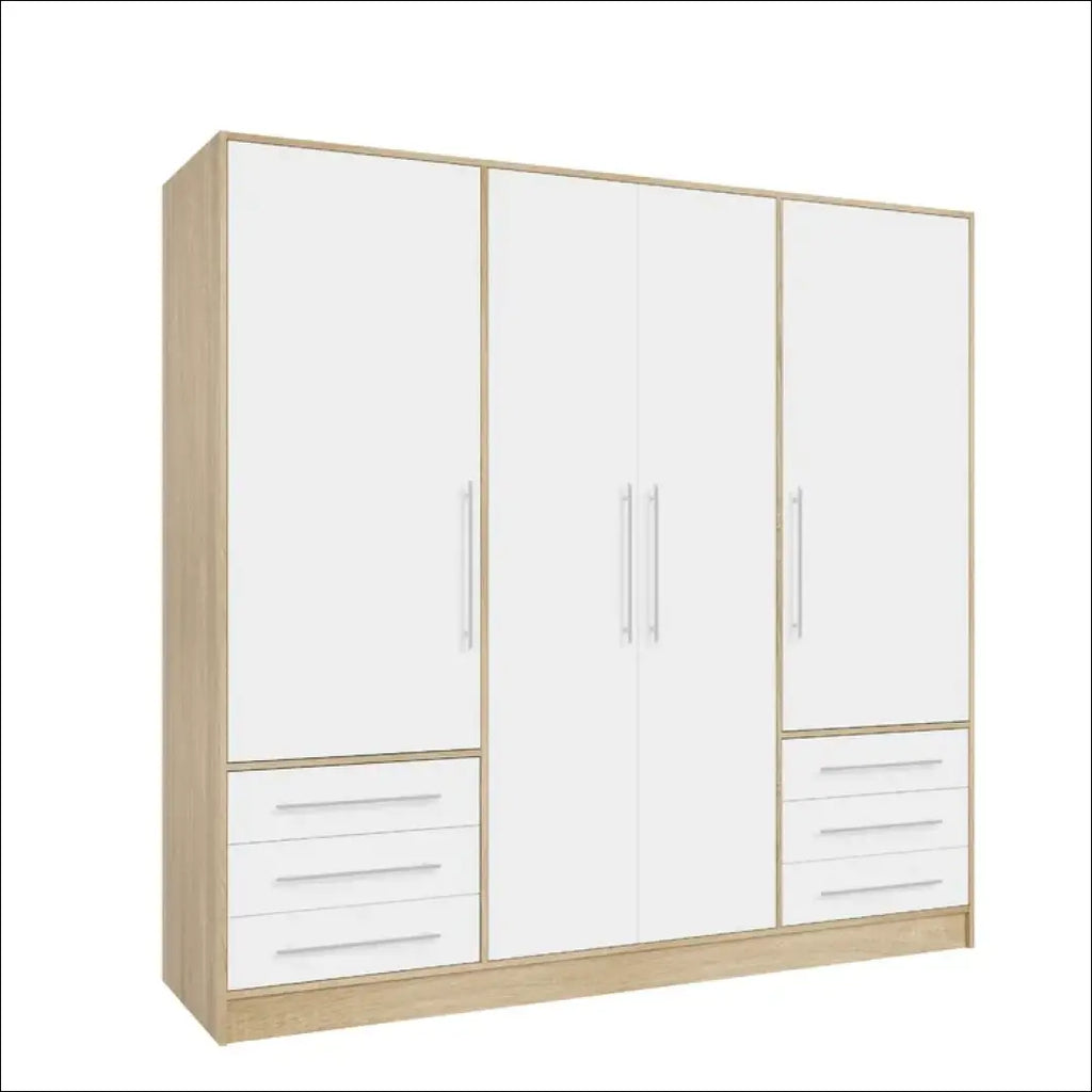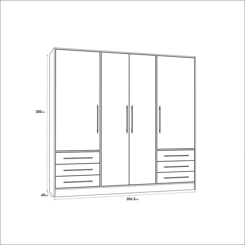 Вместительный четырехдверный шкаф в современном стиле с универсальным декором можно использовать в различных комнатах дома или квартиры. Семь вместительных полок, шесть ящиков и штанга позволяют визуально использовать пространство шкафа. Тонкие серебристые ручки придают всему изделию стильный вид; Максимальная нагрузка на ящик до 5 кг; Максимальная нагрузка на вешалку для одежды — 15 кг; Яркий декор визуально увеличит и освежит комнату; Максимальная нагрузка на полку до 5 кг; «Дизайн почтового индекса»; Упаковка для транспортировки может быть не оригинальной, товар поставляется в полностью или частично собранном виде; |